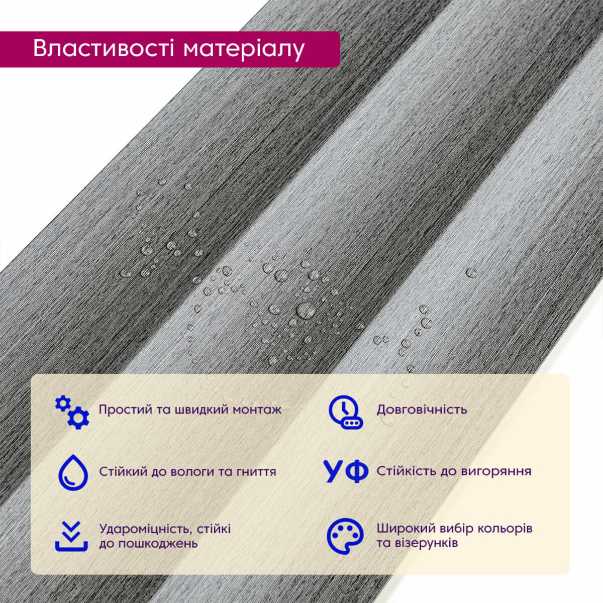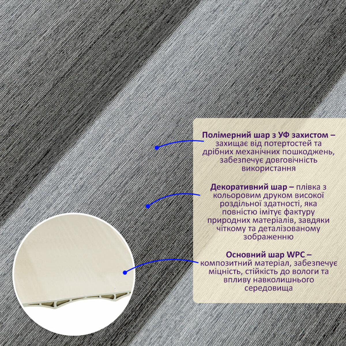 Полімерний шар, що захищає від потертостей та дрібних механічних пошкоджень, забезпечує довговічність використання, а УФ захист допомагає запобігти вигоранню, зберігаючи колір декоративного шару насиченим, за рахунок чого рейка довго має свій первісний естетичний вигляд. Декоративний шар: плівка з кольоровим друком високої роздільної здатності, яка повністю імітує фактуру природних матеріалів, завдяки чіткому та деталізованому зображенню. Основний шар WPC: є композитним матеріалом, який поєднує в собі деревні волокна (або стружку) з полімерними матеріалами, що забезпечує матеріалу міцність, стійкість до вологи і стійкість до впливу зовнішнього середовища. Температурний режим: від -50 º до +80 º С