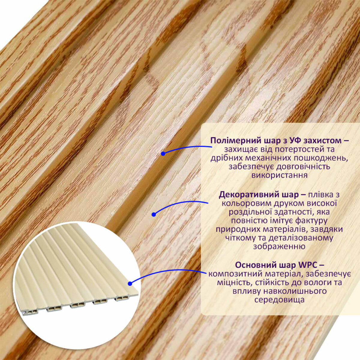 Полімерний шар, що захищає від потертостей та дрібних механічних пошкоджень, забезпечує довговічність використання, а УФ захист допомагає запобігти вигоранню, зберігаючи колір декоративного шару насиченим, за рахунок чого рейка довго має свій первісний естетичний вигляд. Декоративний шар: плівка з кольоровим друком високої роздільної здатності, яка повністю імітує фактуру природних матеріалів, завдяки чіткому та деталізованому зображенню. Основний шар WPC: є композитним матеріалом, який поєднує в собі деревні волокна (або стружку) з полімерними матеріалами, що забезпечує матеріалу міцність, стійкість до вологи і стійкість до впливу зовнішнього середовища. Температурний режим: від -50 º до +80 º С