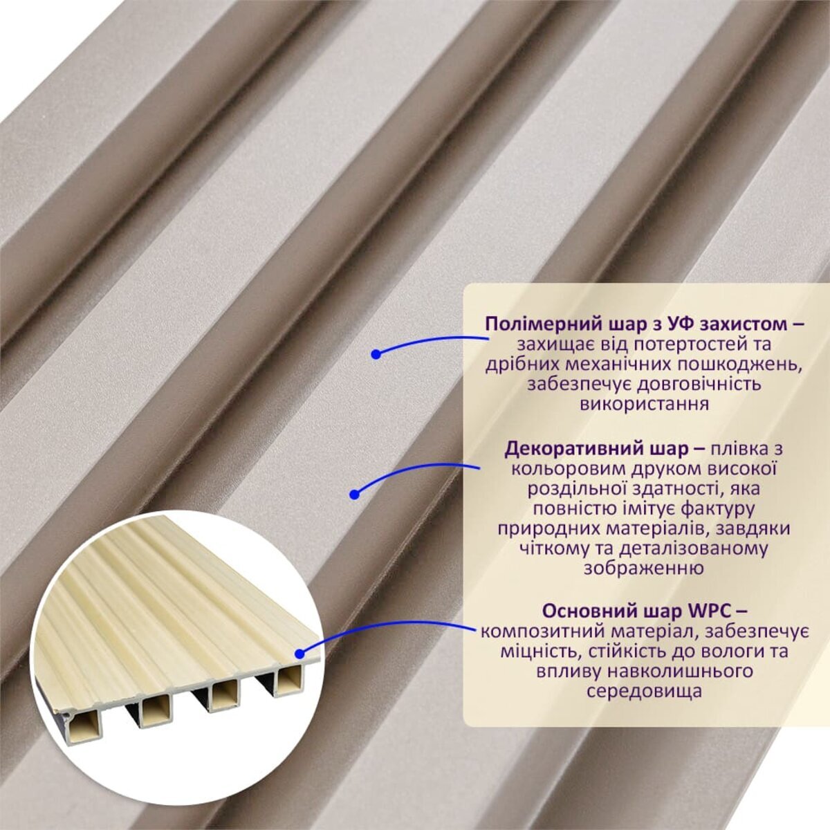Полімерний шар, що захищає від потертостей та дрібних механічних пошкоджень, забезпечує довговічність використання, а УФ захист допомагає запобігти вигоранню, зберігаючи колір декоративного шару насиченим, за рахунок чого рейка довго має свій первісний естетичний вигляд. Декоративний шар: плівка з кольоровим друком високої роздільної здатності, яка повністю імітує фактуру природних матеріалів, завдяки чіткому та деталізованому зображенню. Основний шар WPC: є композитним матеріалом, який поєднує в собі деревні волокна (або стружку) з полімерними матеріалами, що забезпечує матеріалу міцність, стійкість до вологи і стійкість до впливу зовнішнього середовища. Температурний режим: від -50 º до +80 º С