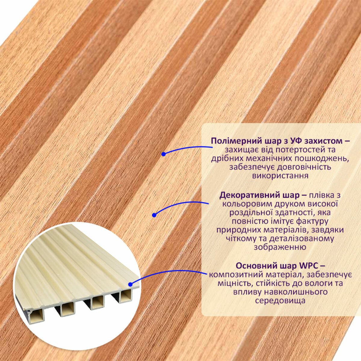 Полімерний шар, що захищає від потертостей та дрібних механічних пошкоджень, забезпечує довговічність використання, а УФ захист допомагає запобігти вигоранню, зберігаючи колір декоративного шару насиченим, за рахунок чого рейка довго має свій первісний естетичний вигляд. Декоративний шар: плівка з кольоровим друком високої роздільної здатності, яка повністю імітує фактуру природних матеріалів, завдяки чіткому та деталізованому зображенню. Основний шар WPC: є композитним матеріалом, який поєднує в собі деревні волокна (або стружку) з полімерними матеріалами, що забезпечує матеріалу міцність, стійкість до вологи і стійкість до впливу зовнішнього середовища. Температурний режим: від -50 º до +80 º С