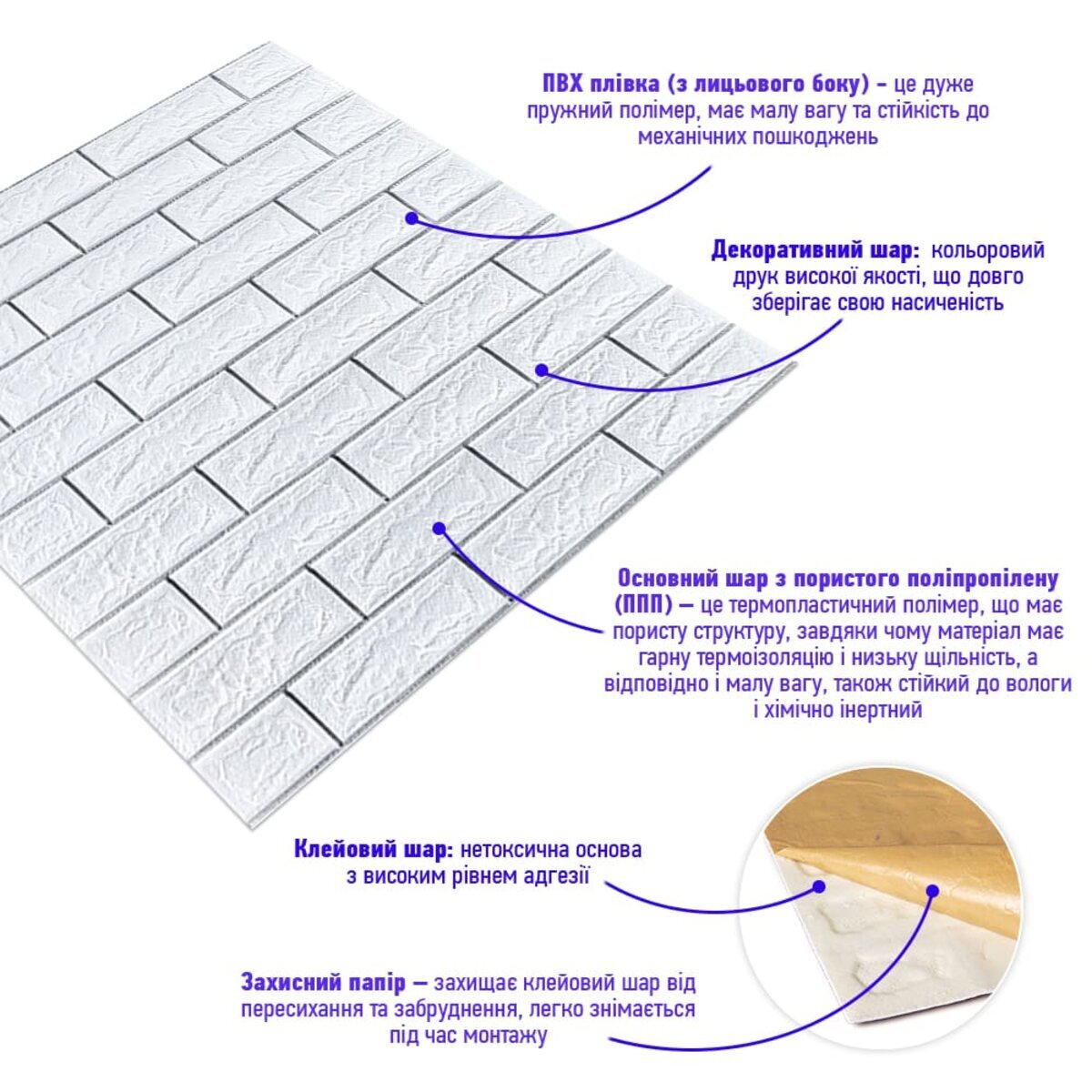 - Захисний папір – оберігає клейовий шар від пересихання та забруднення, легко знімається під час монтажу.