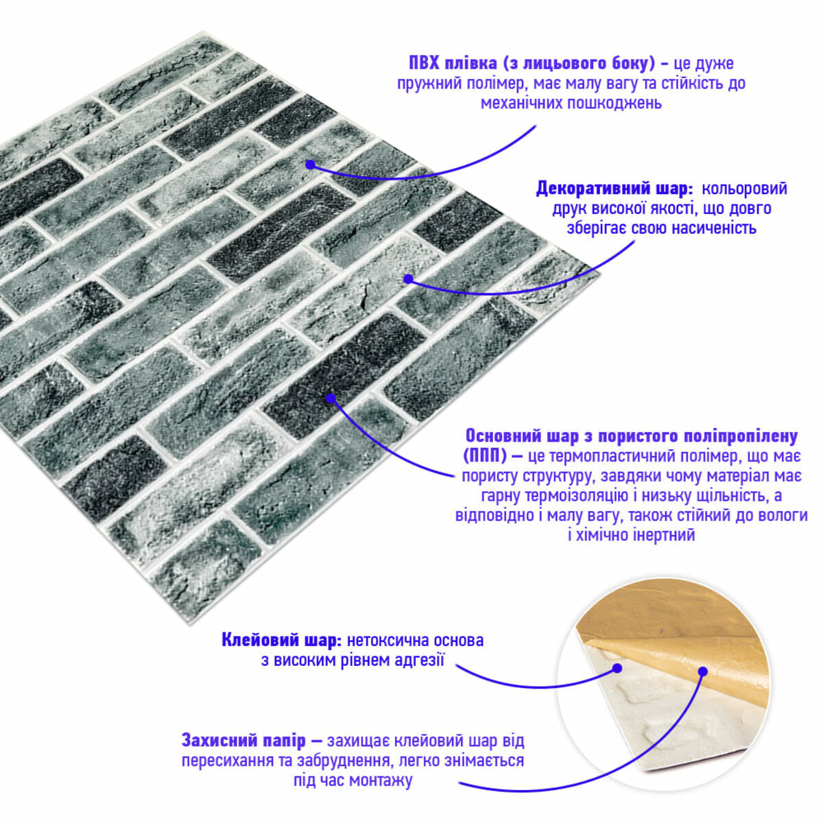 - Захисний папір – оберігає клейовий шар від пересихання та забруднення, легко знімається під час монтажу.