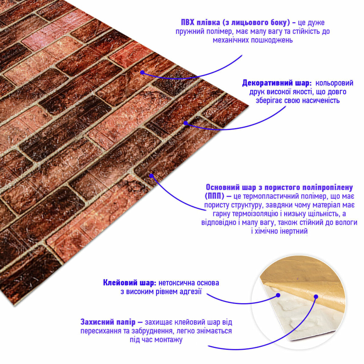Характеристики - Самоклеюча 3D панель під коричневу катеринославську цеглу 3080x700x3мм SW-00001768