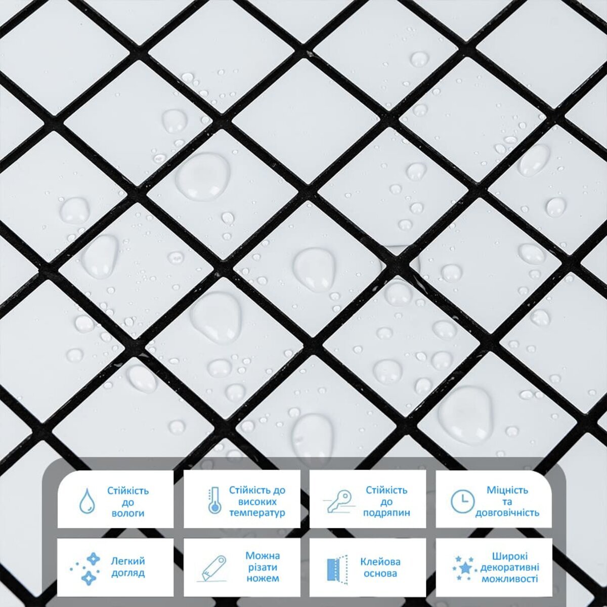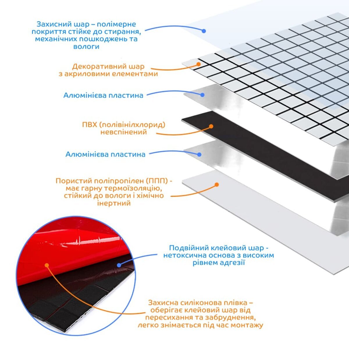 - Захисний силіконізований папір: захищає клейовий шар від пересихання та забруднення, легко знімається під час монтажу.
