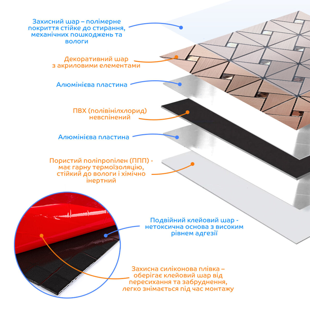 - Захисний силіконізований папір: захищає клейовий шар від пересихання та забруднення, легко знімається під час монтажу.