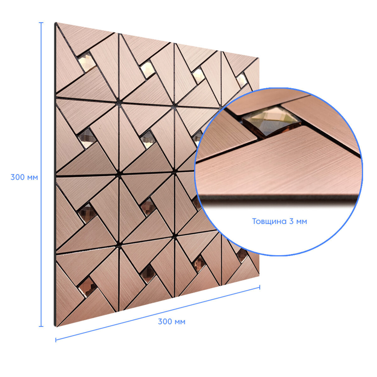 Характеристики - Самоклеюча алюмінієва плитка 300х300х3мм Мідна зі стразами SW-00001416 (D)