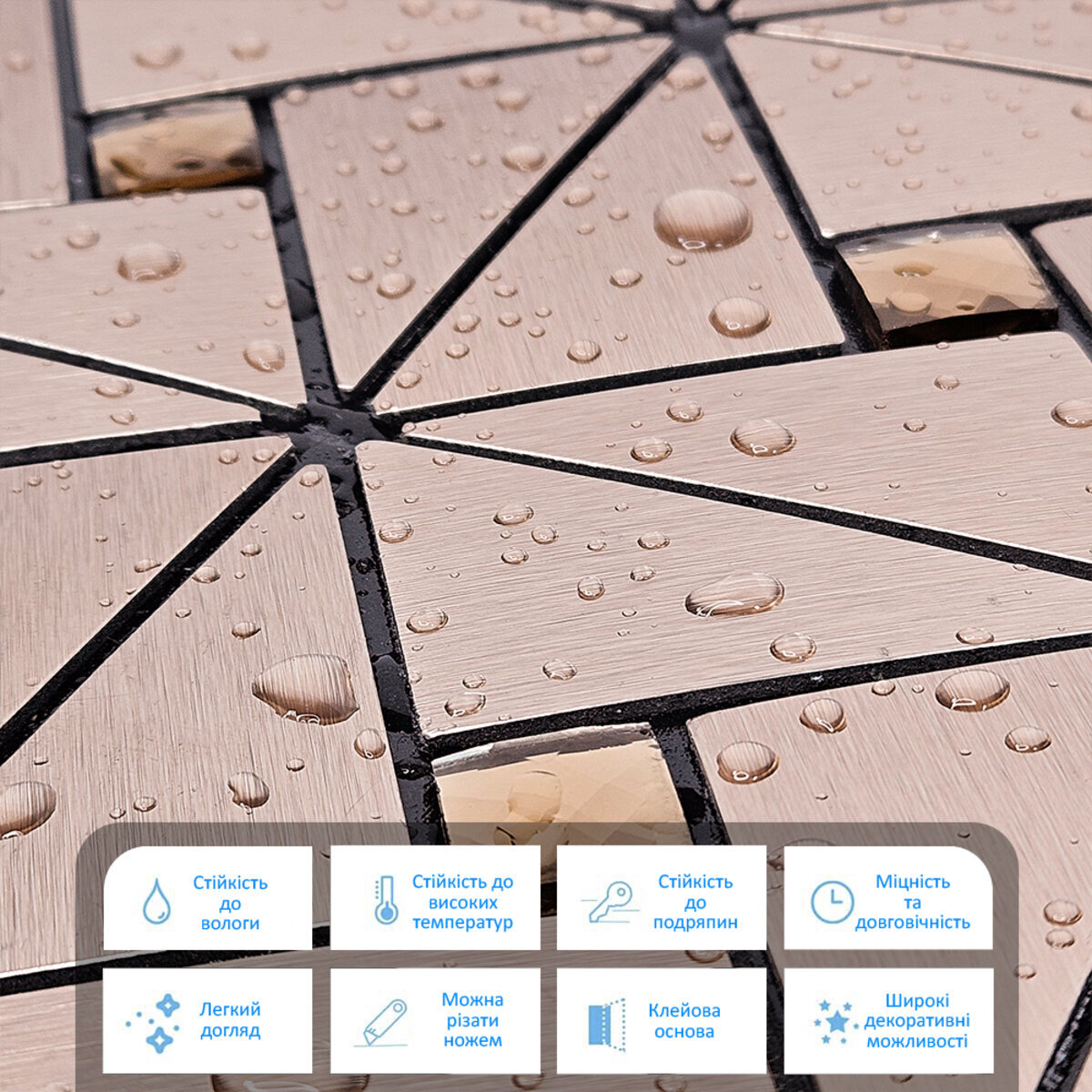 - Легка установка: самоклеюча плитка спрощує процес без додаткового клею.
