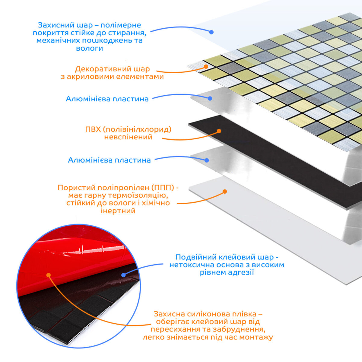 Відгуки - Самоклеюча алюмінієва плитка 300х300х3мм Срібна із золотом шахівниця SW-00001827
