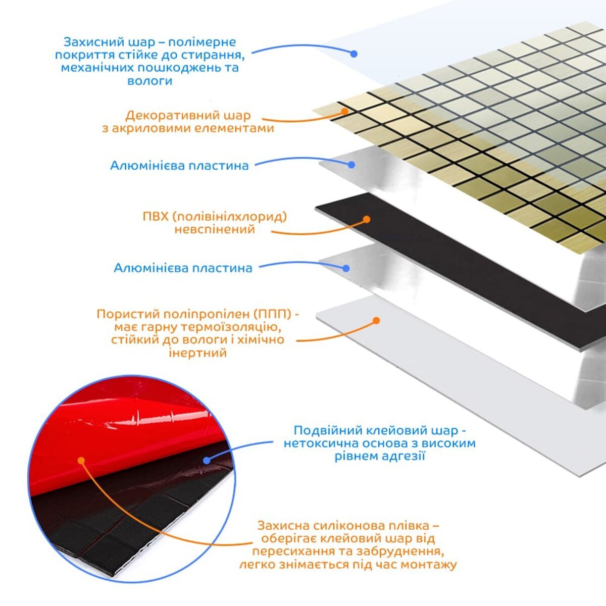 - Захисний силіконізований папір: захищає клейовий шар від пересихання та забруднення, легко знімається під час монтажу.