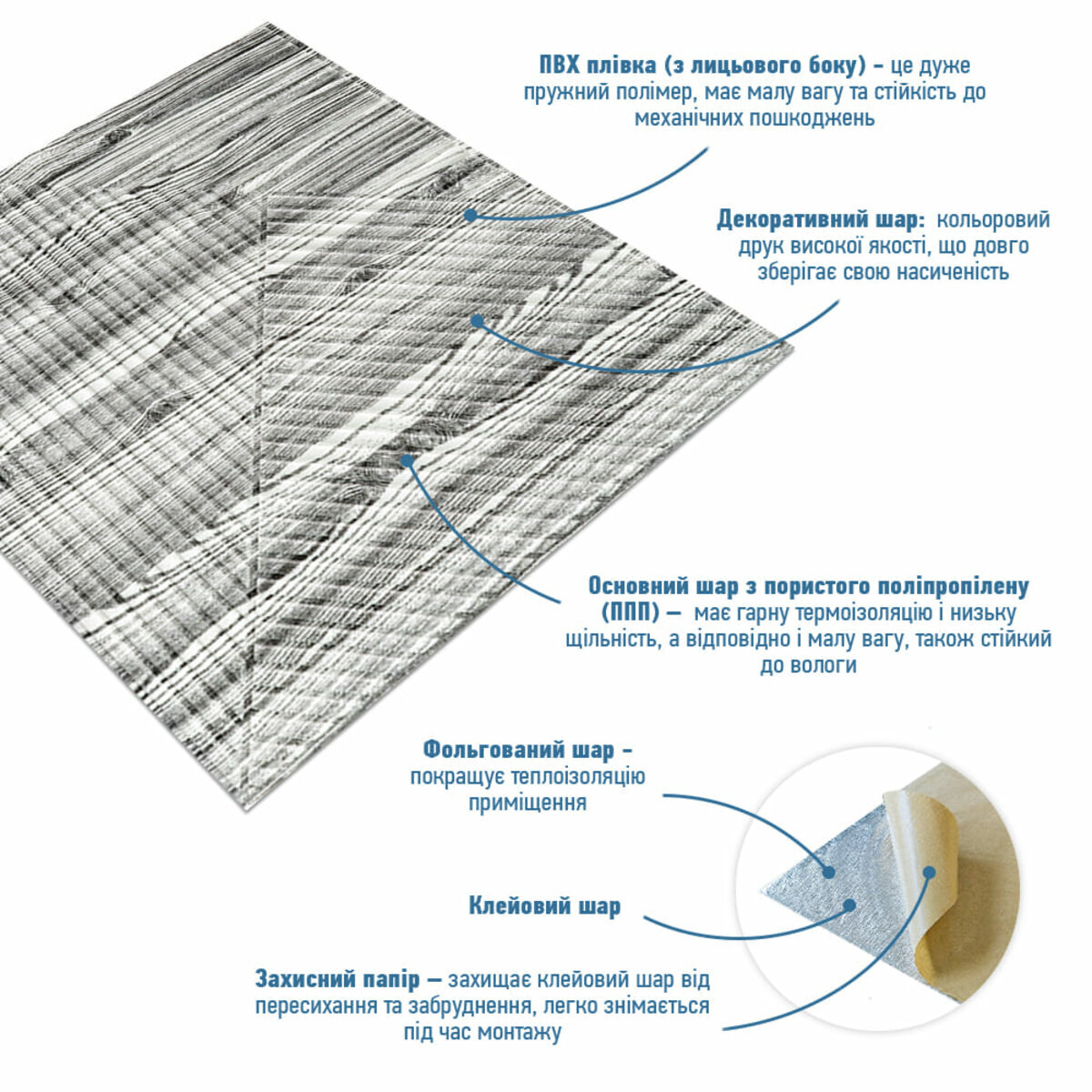 Характеристики - Самоклеюча декоративна 3D панель 500х500х5мм Бамбук Дерево Зебра SW-00002884