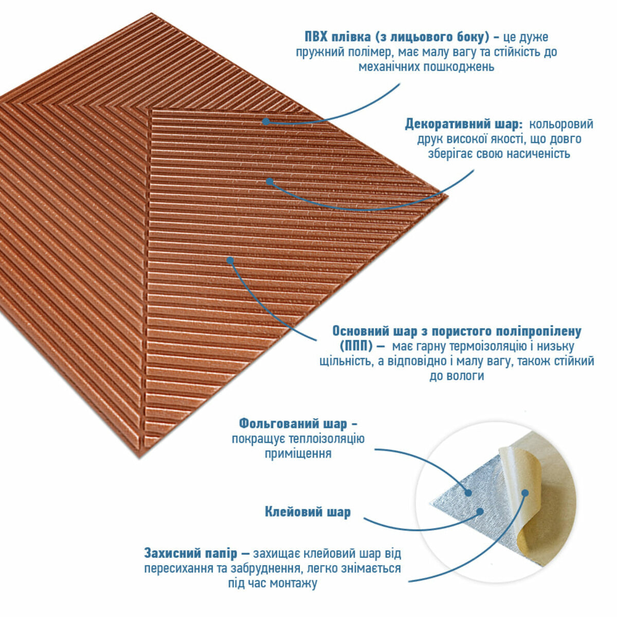 Характеристики - Самоклеюча декоративна 3D панель 500х500х5мм Коричневий SW-00002880
