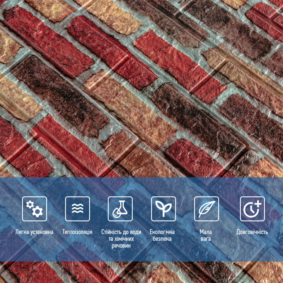 3D панелі самоклеючі – декоративне покриття для стін, виконане з легкого та міцного матеріалу – пористого поліпропілену (ППП). Основна особливість – рельєфний малюнок у вигляді цегли у широкому різноманітті кольорів та наявність клейового шару, що дозволяє встановити панелі без необхідності застосування додаткових матеріалів.