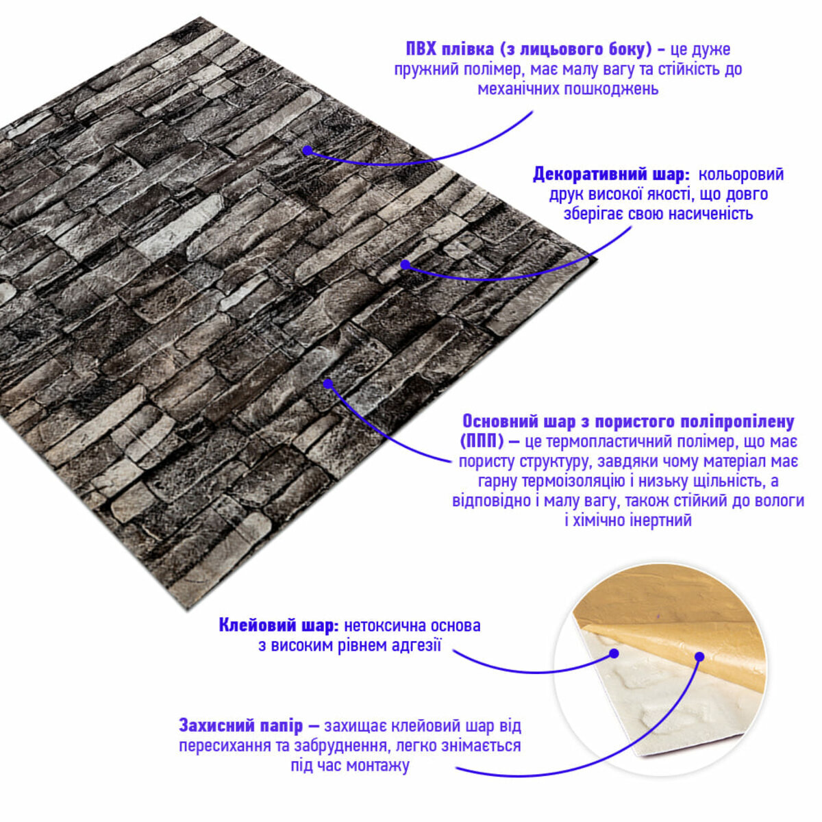 - Захисний папір – оберігає клейовий шар від пересихання та забруднення, легко знімається під час монтажу.