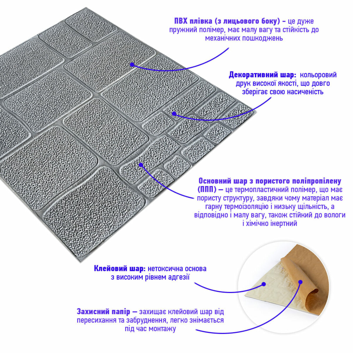 Характеристики - Самоклеюча декоративна 3D панель Камінь срібло 700х700х6мм (153) SW-00000187