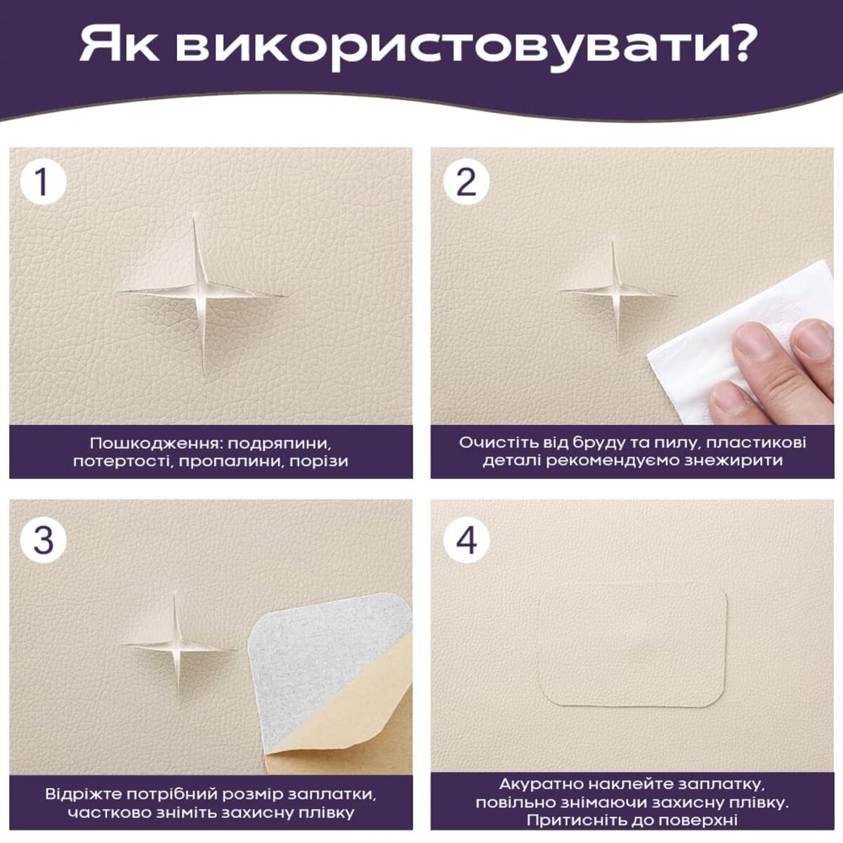 Призначення: ремонтно-оздоблювальні роботи та декорування. Матеріал може використовуватися у різноманітному ремонті дверей, м’яких меблів та стільців, деталей салонів автівок, сидінь велосипедів та мотоциклів, а також для реставрації шкіряно-галантерейної продукції та одягу.