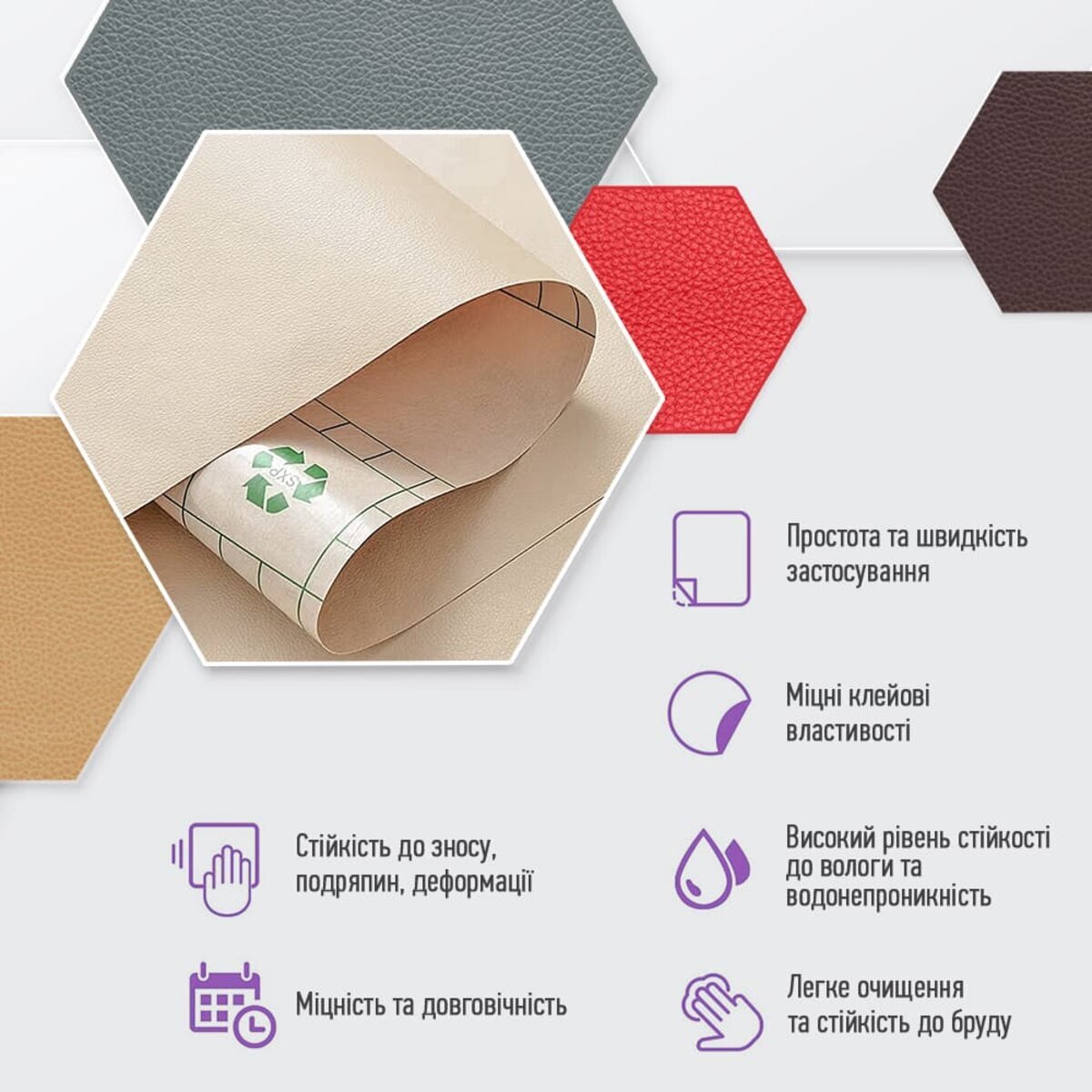 - Екологічна перевага: самоклейна екошкіра виготовляється без використання тваринного шкіряного матеріалу, тому вона є більш екологічною альтернативою натуральній шкірі.