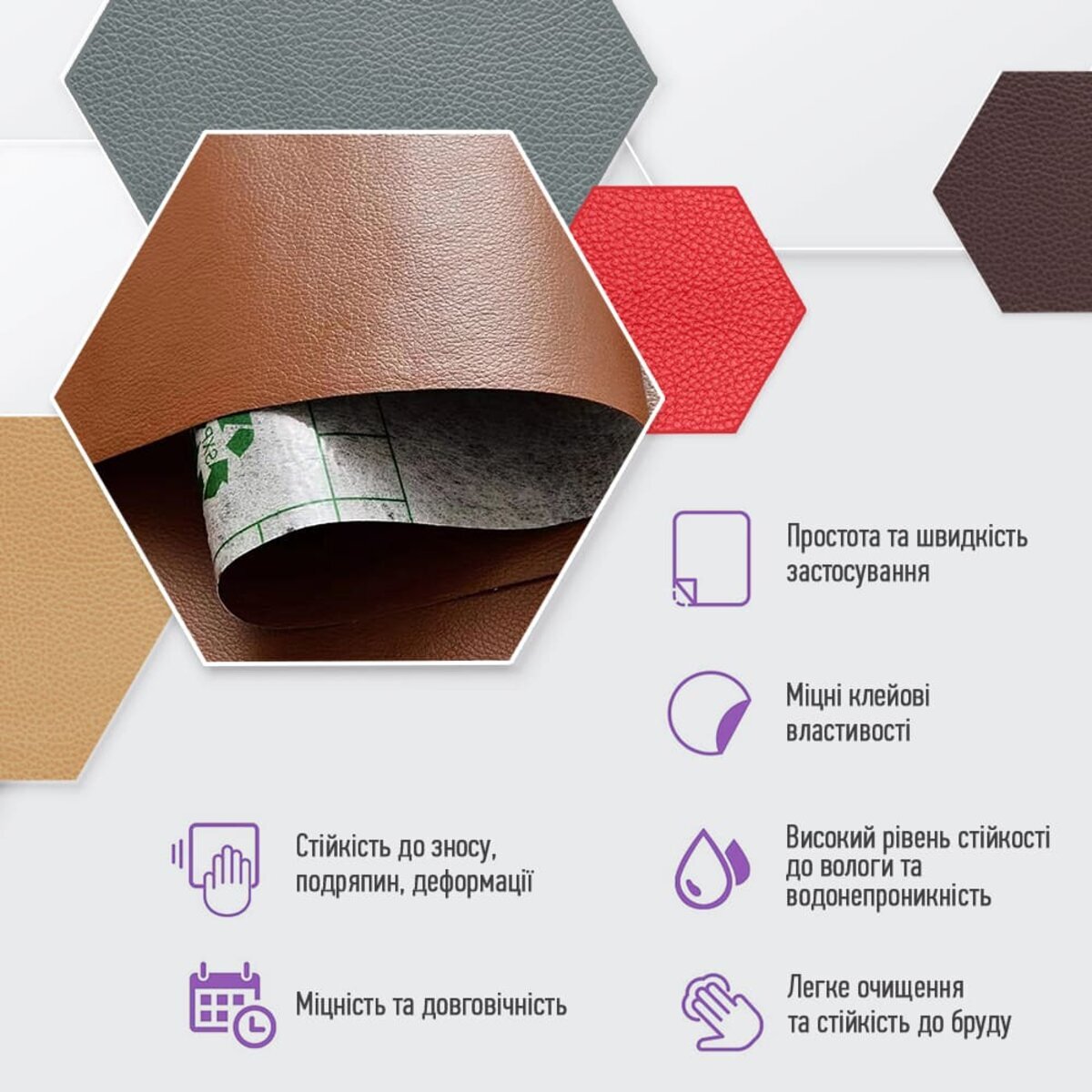 - Екологічна перевага: самоклейна екошкіра виготовляється без використання тваринного шкіряного матеріалу, тому вона є більш екологічною альтернативою натуральній шкірі.