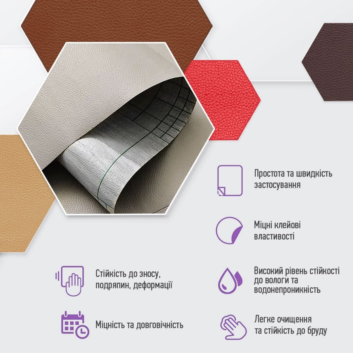 - Екологічна перевага: самоклейна екошкіра виготовляється без використання тваринного шкіряного матеріалу, тому вона є більш екологічною альтернативою натуральній шкірі.