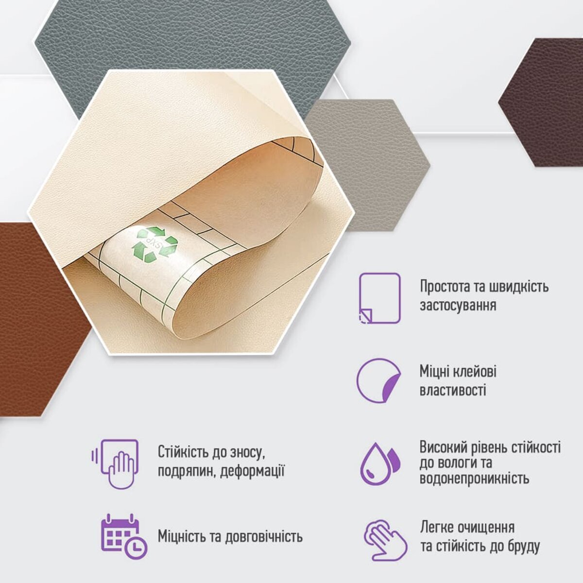- Екологічна перевага: самоклейна екошкіра виготовляється без використання тваринного шкіряного матеріалу, тому вона є більш екологічною альтернативою натуральній шкірі.