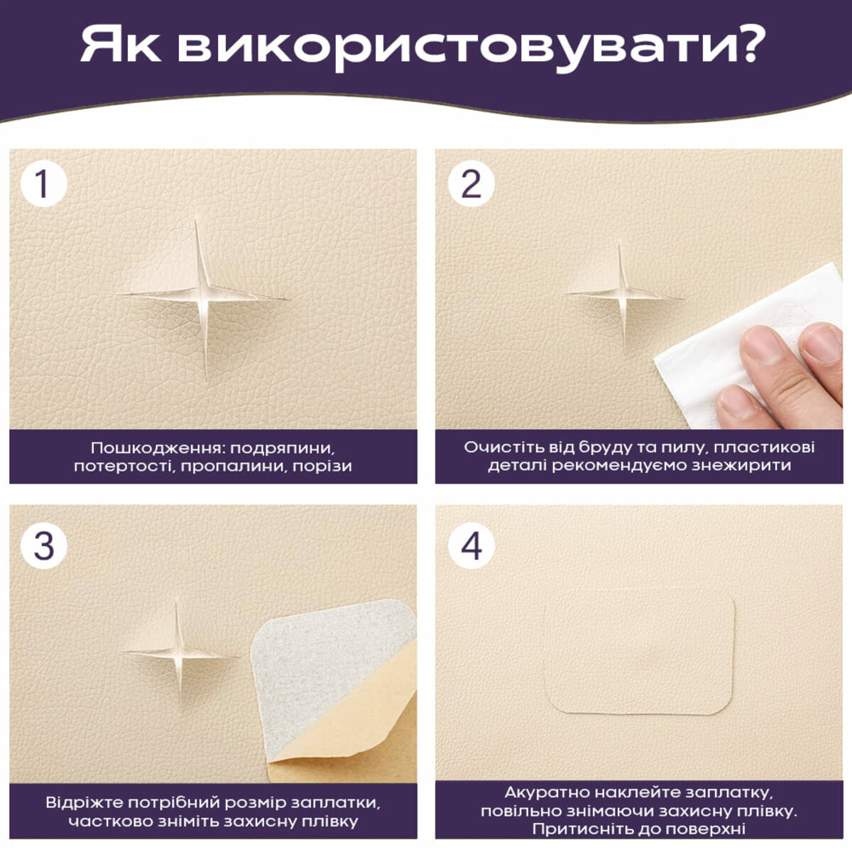 Призначення: ремонтно-оздоблювальні роботи та декорування. Матеріал може використовуватися у різноманітному ремонті дверей, м’яких меблів та стільців, деталей салонів автівок, сидінь велосипедів та мотоциклів, а також для реставрації шкіряно-галантерейної продукції та одягу.