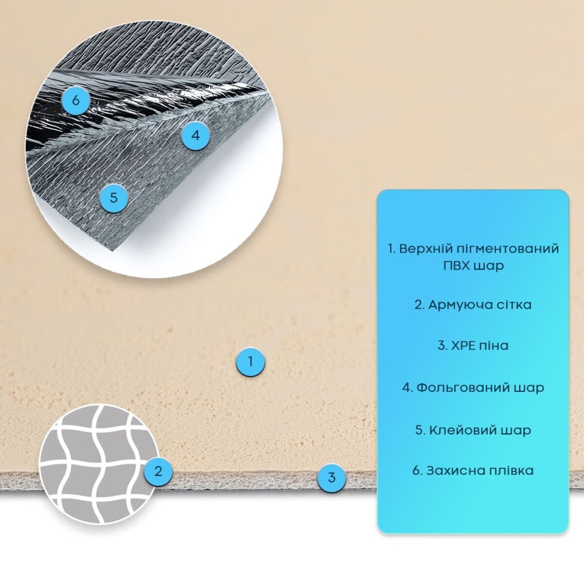 Пігментований ПВХ шар — це декоративний верхній шар із полівінілхлориду з додаванням пігментів та стабілізаторів, які забезпечують стійкість кольору та захист від УФ-випромінювання. Цей шар формує детальну фактуру й дизайн матеріалу, максимально наближені до декоративної штукатурки, включаючи дрібні нерівності та текстурні вкраплення. Він стійкий до вологи та впливу хімічних речовин, дуже гнучкий, не схильний до заломів і має здатність відновлювати форму після деформації. Армувальна сітка — це внутрішній зміцнювальний шар, який підвищує стабільність і міцність верхнього шару ПВХ. Виготовлена зі синтетичного матеріалу, вона не розтягується, допомагає зберігати форму та фактуру під час монтажу й експлуатації, а також запобігає деформаціям матеріалу.ХРЕ (спінений поліетилен) — це матеріал, який роблять із поліетилену, спеціально переплавляючи його та “зшиваючи” молекули між собою. Завдяки такій технології матеріал стає міцнішим і краще витримує температуру. Усередині ХРЕ є багато дрібних закритих комірок — саме через це він виходить легким, пружним і добре утримує тепло. Закрита структура також робить його стійким до вологи та довговічним у використанні.Фольгований шар виконує дві ключові функції: він відбиває теплові хвилі, забезпечуючи додаткову теплоізоляцію, а також захищає матеріал від вологи. Завдяки цьому шпалери стають більш стійкими до вологого середовища та чудово підходять для використання на кухнях. Окрім цього, фольгований шар додатково зміцнює ХРЕ-основу, запобігаючи її розтягуванню та зберігаючи форму матеріалу під час монтажу та експлуатації.Подвійний клейовий шар: нетоксична основа з високим рівнем адгезії.Захисна фольгована плівка: оберігає клейовий шар від пересихання та забруднення, легко знімається під час монтажу.Застосування: внутрішні оздоблювальні роботи: декорування стін у всіх видах житлових приміщень (кухня, ванна кімната, вітальня, дитяча або спальня, вхідна група) та комерційних приміщень (офісні приміщення, зони рецепцій, магазини, салони краси або фітнес-центри, місця громадської присутності, майстерні), меблів, дверей та інших рівних поверхонь.