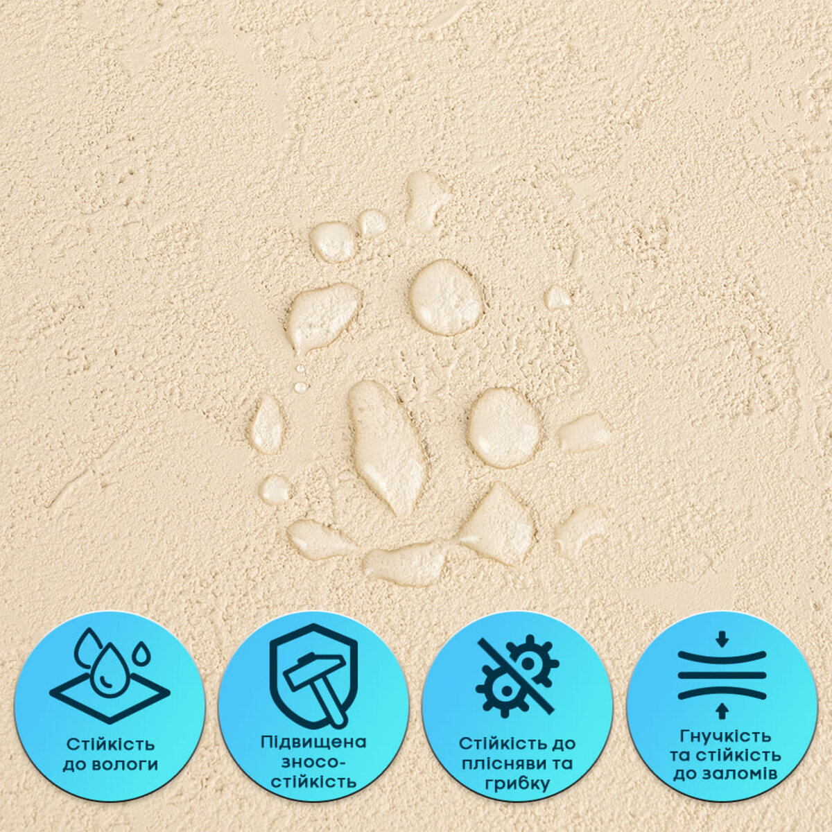 Гнучкість без деформаціїМатеріал є еластичним і легко згинається, що дозволяє монтувати його на нерівні та складні поверхні. Завдяки вбудованій армувальній сітці штукатурка не розтягується, не створює заломів і не деформується під час монтажу або експлуатації. Це гарантує стабільну геометрію та акуратний вигляд після наклеювання.Самоклеюча основаШар клею забезпечує швидке та зручне встановлення без додаткових інструментів і матеріалів. Монтаж займає мінімум часу: смуги клеяться стик-у-стик, рівно лягають на поверхню та не розходяться. Матеріал легко ріжеться ножицями або монтажним ножем. Стійкість до вологи та париГнучка штукатурка не вбирає воду, не набухає та не деформується під впливом вологи. Матеріал стійкий до пари, не сприяє утворенню плісняви та підходить для приміщень із підвищеною вологістю — кухонь, ванних кімнат. Може застосовуватися в зоні кухонного фартуха (за умови відступу від плити на 25-30 см).Підвищена міцність та зносостійкістьКомбінація вінілу та армувальної сітки забезпечує матеріалу довговічність. Покриття не тріскається, не кришиться і добре витримує щоденне використання без втрати зовнішнього вигляду.Невибагливість у доглядіПоверхня легко очищається вологою серветкою чи нейтральними мийними засобами. У разі пошкодження елемента його можна швидко замінити без демонтажу всієї поверхні.Тепло- та звукоізоляційні властивостіЗавдяки структурі матеріал помірно приглушує звуки та покращує теплоізоляцію стін, створюючи більш комфортні умови в приміщенні.Екологічна безпекаМатеріал виготовляється з безпечної сировини, не виділяє шкідливих речовин, підходить для житлових приміщень та є нетоксичним для навколишнього середовища. Розрахунок необхідної кількості матеріалу