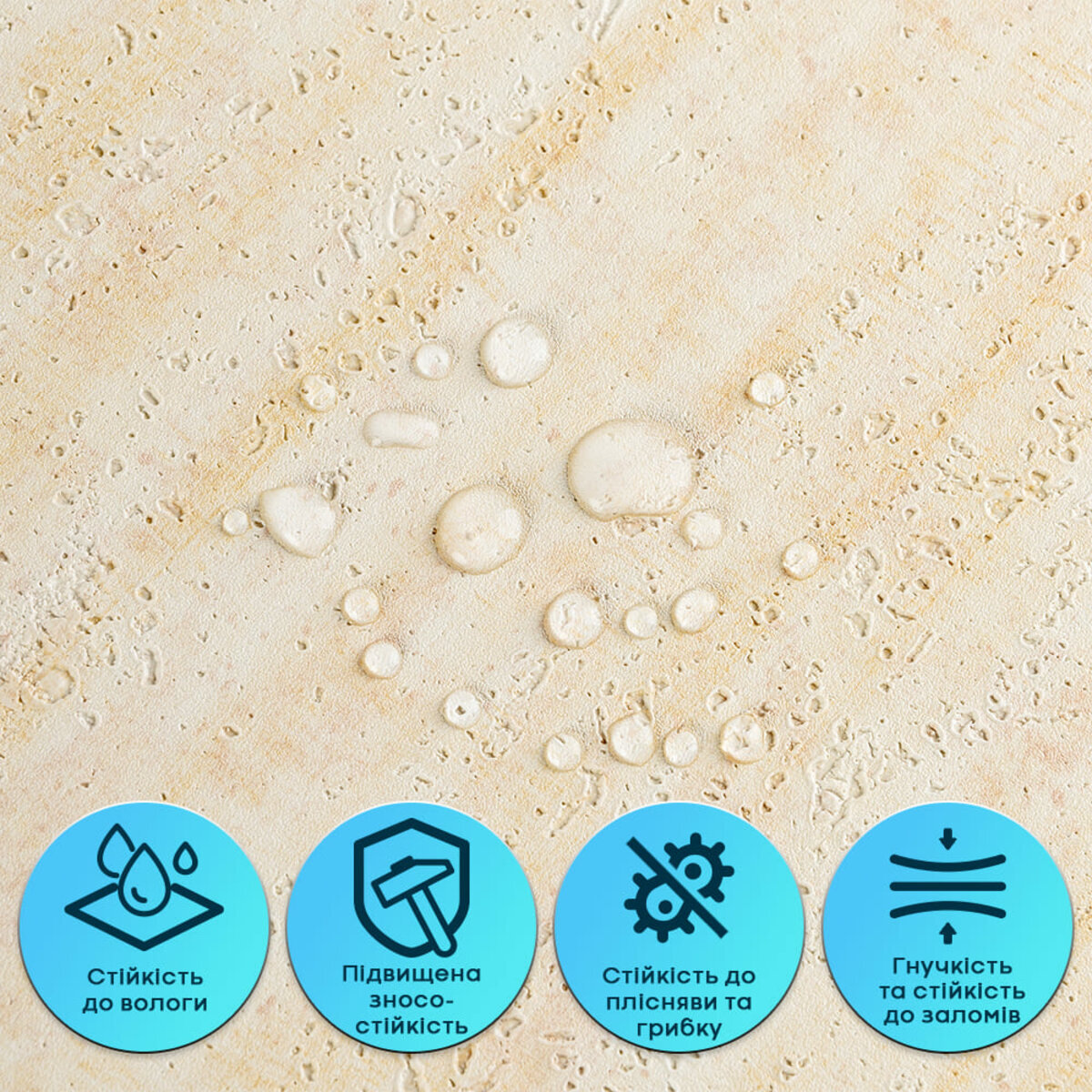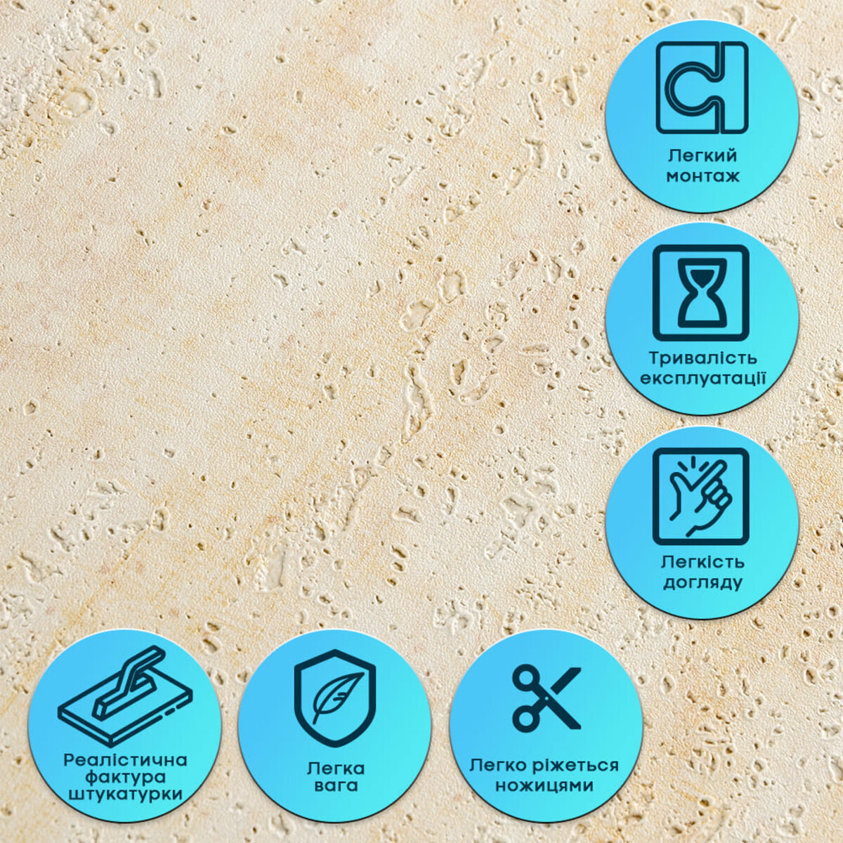 Гнучкість без деформаціїМатеріал є еластичним і легко згинається, що дозволяє монтувати його на нерівні та складні поверхні. Завдяки вбудованій армувальній сітці штукатурка не розтягується, не створює заломів і не деформується під час монтажу або експлуатації. Це гарантує стабільну геометрію та акуратний вигляд після наклеювання.Самоклеюча основаШар клею забезпечує швидке та зручне встановлення без додаткових інструментів і матеріалів. Монтаж займає мінімум часу: смуги клеяться стик-у-стик, рівно лягають на поверхню та не розходяться. Матеріал легко ріжеться ножицями або монтажним ножем. Стійкість до вологи та париГнучка штукатурка не вбирає воду, не набухає та не деформується під впливом вологи. Матеріал стійкий до пари, не сприяє утворенню плісняви та підходить для приміщень із підвищеною вологістю — кухонь, ванних кімнат. Може застосовуватися в зоні кухонного фартуха (за умови відступу від плити на 25-30 см).Підвищена міцність та зносостійкістьКомбінація вінілу та армувальної сітки забезпечує матеріалу довговічність. Покриття не тріскається, не кришиться і добре витримує щоденне використання без втрати зовнішнього вигляду.Невибагливість у доглядіПоверхня легко очищається вологою серветкою чи нейтральними мийними засобами. У разі пошкодження елемента його можна швидко замінити без демонтажу всієї поверхні.Тепло- та звукоізоляційні властивостіЗавдяки структурі матеріал помірно приглушує звуки та покращує теплоізоляцію стін, створюючи більш комфортні умови в приміщенні.Екологічна безпекаМатеріал виготовляється з безпечної сировини, не виділяє шкідливих речовин, підходить для житлових приміщень та є нетоксичним для навколишнього середовища. Розрахунок необхідної кількості матеріалу