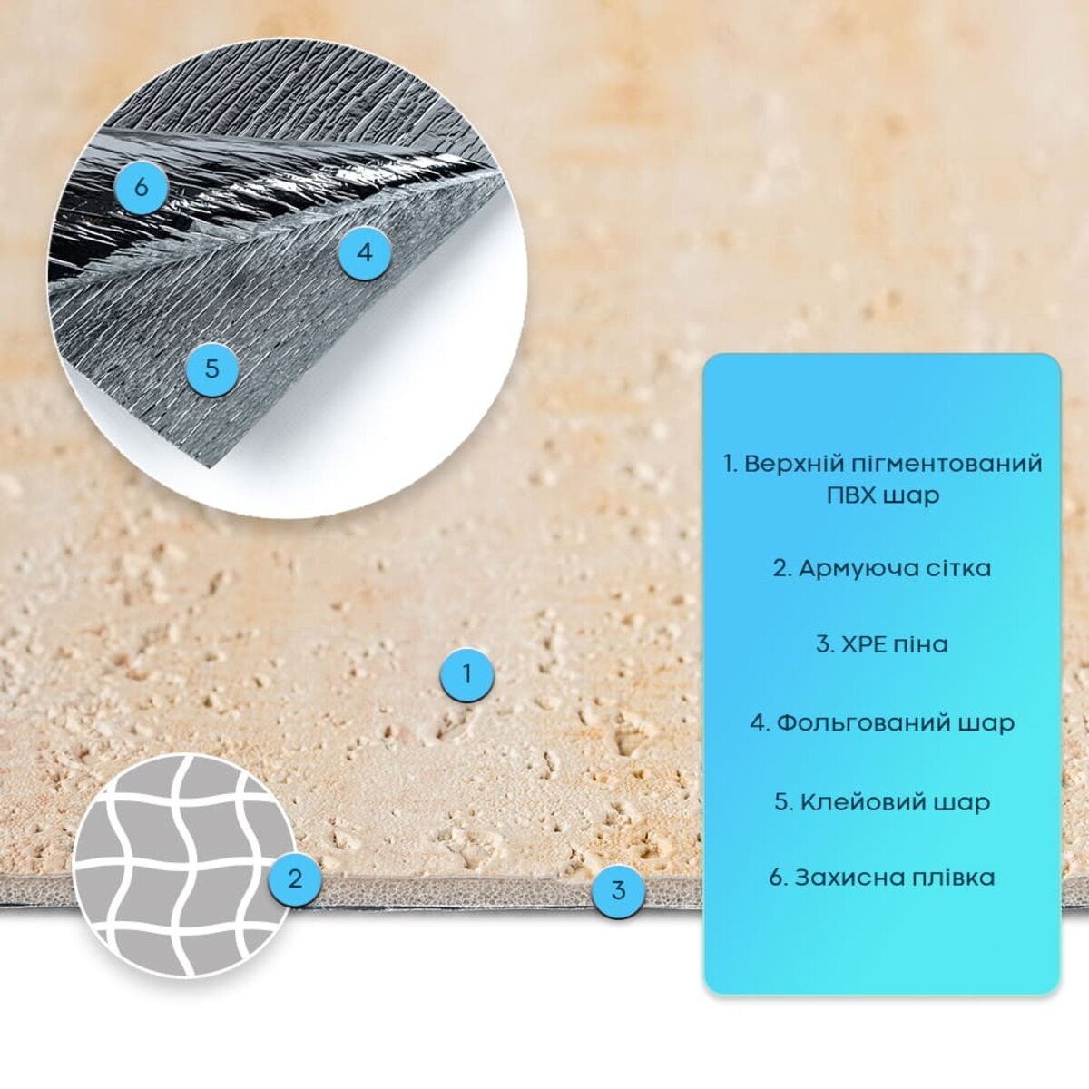 Пігментований ПВХ шар — це декоративний верхній шар із полівінілхлориду з додаванням пігментів та стабілізаторів, які забезпечують стійкість кольору та захист від УФ-випромінювання. Цей шар формує детальну фактуру й дизайн матеріалу, максимально наближені до декоративної штукатурки, включаючи дрібні нерівності та текстурні вкраплення. Він стійкий до вологи та впливу хімічних речовин, дуже гнучкий, не схильний до заломів і має здатність відновлювати форму після деформації. Армувальна сітка — це внутрішній зміцнювальний шар, який підвищує стабільність і міцність верхнього шару ПВХ. Виготовлена зі синтетичного матеріалу, вона не розтягується, допомагає зберігати форму та фактуру під час монтажу й експлуатації, а також запобігає деформаціям матеріалу.ХРЕ (спінений поліетилен) — це матеріал, який роблять із поліетилену, спеціально переплавляючи його та “зшиваючи” молекули між собою. Завдяки такій технології матеріал стає міцнішим і краще витримує температуру. Усередині ХРЕ є багато дрібних закритих комірок — саме через це він виходить легким, пружним і добре утримує тепло. Закрита структура також робить його стійким до вологи та довговічним у використанні.Фольгований шар виконує дві ключові функції: він відбиває теплові хвилі, забезпечуючи додаткову теплоізоляцію, а також захищає матеріал від вологи. Завдяки цьому шпалери стають більш стійкими до вологого середовища та чудово підходять для використання на кухнях. Окрім цього, фольгований шар додатково зміцнює ХРЕ-основу, запобігаючи її розтягуванню та зберігаючи форму матеріалу під час монтажу та експлуатації.Подвійний клейовий шар: нетоксична основа з високим рівнем адгезії.Захисна фольгована плівка: оберігає клейовий шар від пересихання та забруднення, легко знімається під час монтажу.Застосування: внутрішні оздоблювальні роботи: декорування стін у всіх видах житлових приміщень (кухня, ванна кімната, вітальня, дитяча або спальня, вхідна група) та комерційних приміщень (офісні приміщення, зони рецепцій, магазини, салони краси або фітнес-центри, місця громадської присутності, майстерні), меблів, дверей та інших рівних поверхонь.