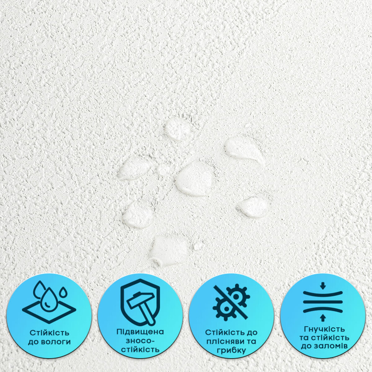 Пігментований ПВХ шар — це декоративний верхній шар із полівінілхлориду з додаванням пігментів та стабілізаторів, які забезпечують стійкість кольору та захист від УФ-випромінювання. Цей шар формує детальну фактуру й дизайн матеріалу, максимально наближені до декоративної штукатурки, включаючи дрібні нерівності та текстурні вкраплення. Він стійкий до вологи та впливу хімічних речовин, дуже гнучкий, не схильний до заломів і має здатність відновлювати форму після деформації. Армувальна сітка — це внутрішній зміцнювальний шар, який підвищує стабільність і міцність верхнього шару ПВХ. Виготовлена зі синтетичного матеріалу, вона не розтягується, допомагає зберігати форму та фактуру під час монтажу й експлуатації, а також запобігає деформаціям матеріалу.ХРЕ (спінений поліетилен) — це матеріал, який роблять із поліетилену, спеціально переплавляючи його та “зшиваючи” молекули між собою. Завдяки такій технології матеріал стає міцнішим і краще витримує температуру. Усередині ХРЕ є багато дрібних закритих комірок — саме через це він виходить легким, пружним і добре утримує тепло. Закрита структура також робить його стійким до вологи та довговічним у використанні.Фольгований шар виконує дві ключові функції: він відбиває теплові хвилі, забезпечуючи додаткову теплоізоляцію, а також захищає матеріал від вологи. Завдяки цьому шпалери стають більш стійкими до вологого середовища та чудово підходять для використання на кухнях. Окрім цього, фольгований шар додатково зміцнює ХРЕ-основу, запобігаючи її розтягуванню та зберігаючи форму матеріалу під час монтажу та експлуатації.Подвійний клейовий шар: нетоксична основа з високим рівнем адгезії.Захисна фольгована плівка: оберігає клейовий шар від пересихання та забруднення, легко знімається під час монтажу.Застосування: внутрішні оздоблювальні роботи: декорування стін у всіх видах житлових приміщень (кухня, ванна кімната, вітальня, дитяча або спальня, вхідна група) та комерційних приміщень (офісні приміщення, зони рецепцій, магазини, салони краси або фітнес-центри, місця громадської присутності, майстерні), меблів, дверей та інших рівних поверхонь.