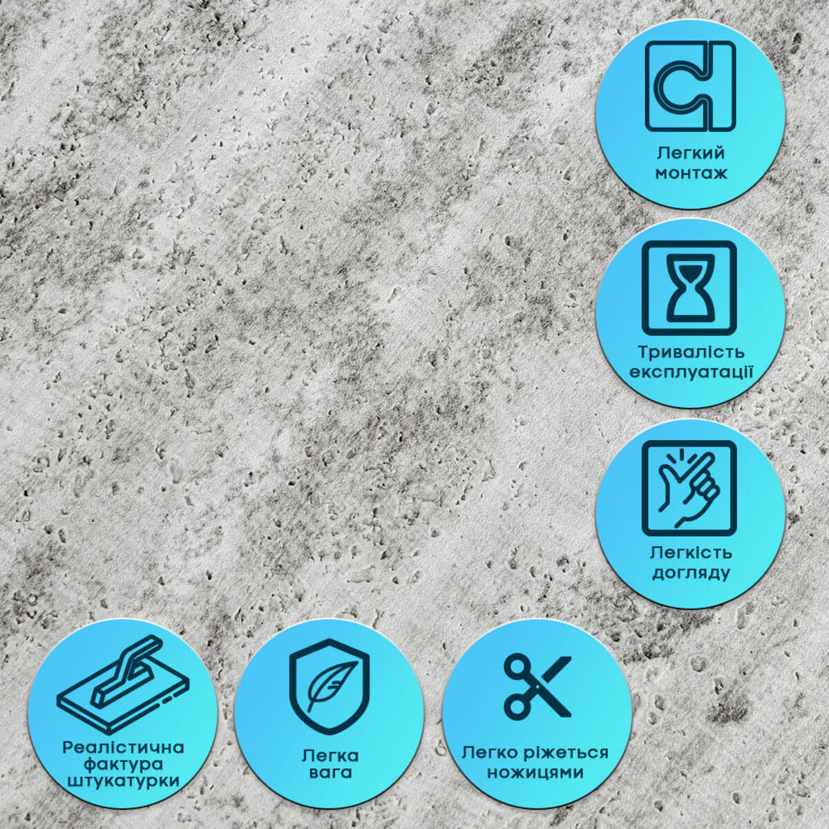 Гнучкість без деформаціїМатеріал є еластичним і легко згинається, що дозволяє монтувати його на нерівні та складні поверхні. Завдяки вбудованій армувальній сітці штукатурка не розтягується, не створює заломів і не деформується під час монтажу або експлуатації. Це гарантує стабільну геометрію та акуратний вигляд після наклеювання.Самоклеюча основаШар клею забезпечує швидке та зручне встановлення без додаткових інструментів і матеріалів. Монтаж займає мінімум часу: смуги клеяться стик-у-стик, рівно лягають на поверхню та не розходяться. Матеріал легко ріжеться ножицями або монтажним ножем. Стійкість до вологи та париГнучка штукатурка не вбирає воду, не набухає та не деформується під впливом вологи. Матеріал стійкий до пари, не сприяє утворенню плісняви та підходить для приміщень із підвищеною вологістю — кухонь, ванних кімнат. Може застосовуватися в зоні кухонного фартуха (за умови відступу від плити на 25-30 см).Підвищена міцність та зносостійкістьКомбінація вінілу та армувальної сітки забезпечує матеріалу довговічність. Покриття не тріскається, не кришиться і добре витримує щоденне використання без втрати зовнішнього вигляду.Невибагливість у доглядіПоверхня легко очищається вологою серветкою чи нейтральними мийними засобами. У разі пошкодження елемента його можна швидко замінити без демонтажу всієї поверхні.Тепло- та звукоізоляційні властивостіЗавдяки структурі матеріал помірно приглушує звуки та покращує теплоізоляцію стін, створюючи більш комфортні умови в приміщенні.Екологічна безпекаМатеріал виготовляється з безпечної сировини, не виділяє шкідливих речовин, підходить для житлових приміщень та є нетоксичним для навколишнього середовища. Розрахунок необхідної кількості матеріалу