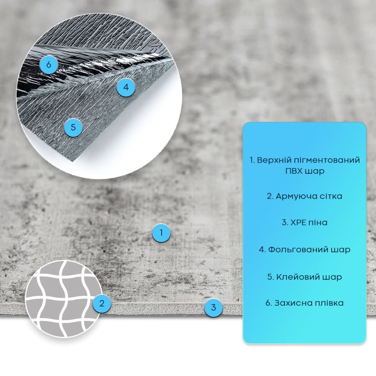 Пігментований ПВХ шар — це декоративний верхній шар із полівінілхлориду з додаванням пігментів та стабілізаторів, які забезпечують стійкість кольору та захист від УФ-випромінювання. Цей шар формує детальну фактуру й дизайн матеріалу, максимально наближені до декоративної штукатурки, включаючи дрібні нерівності та текстурні вкраплення. Він стійкий до вологи та впливу хімічних речовин, дуже гнучкий, не схильний до заломів і має здатність відновлювати форму після деформації. Армувальна сітка — це внутрішній зміцнювальний шар, який підвищує стабільність і міцність верхнього шару ПВХ. Виготовлена зі синтетичного матеріалу, вона не розтягується, допомагає зберігати форму та фактуру під час монтажу й експлуатації, а також запобігає деформаціям матеріалу.ХРЕ (спінений поліетилен) — це матеріал, який роблять із поліетилену, спеціально переплавляючи його та “зшиваючи” молекули між собою. Завдяки такій технології матеріал стає міцнішим і краще витримує температуру. Усередині ХРЕ є багато дрібних закритих комірок — саме через це він виходить легким, пружним і добре утримує тепло. Закрита структура також робить його стійким до вологи та довговічним у використанні.Фольгований шар виконує дві ключові функції: він відбиває теплові хвилі, забезпечуючи додаткову теплоізоляцію, а також захищає матеріал від вологи. Завдяки цьому шпалери стають більш стійкими до вологого середовища та чудово підходять для використання на кухнях. Окрім цього, фольгований шар додатково зміцнює ХРЕ-основу, запобігаючи її розтягуванню та зберігаючи форму матеріалу під час монтажу та експлуатації.Подвійний клейовий шар: нетоксична основа з високим рівнем адгезії.Захисна фольгована плівка: оберігає клейовий шар від пересихання та забруднення, легко знімається під час монтажу.Застосування: внутрішні оздоблювальні роботи: декорування стін у всіх видах житлових приміщень (кухня, ванна кімната, вітальня, дитяча або спальня, вхідна група) та комерційних приміщень (офісні приміщення, зони рецепцій, магазини, салони краси або фітнес-центри, місця громадської присутності, майстерні), меблів, дверей та інших рівних поверхонь.