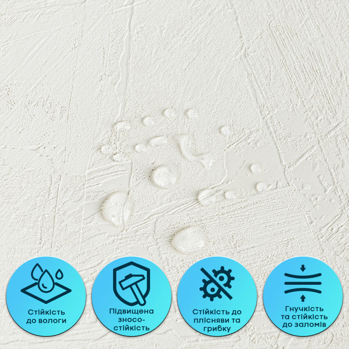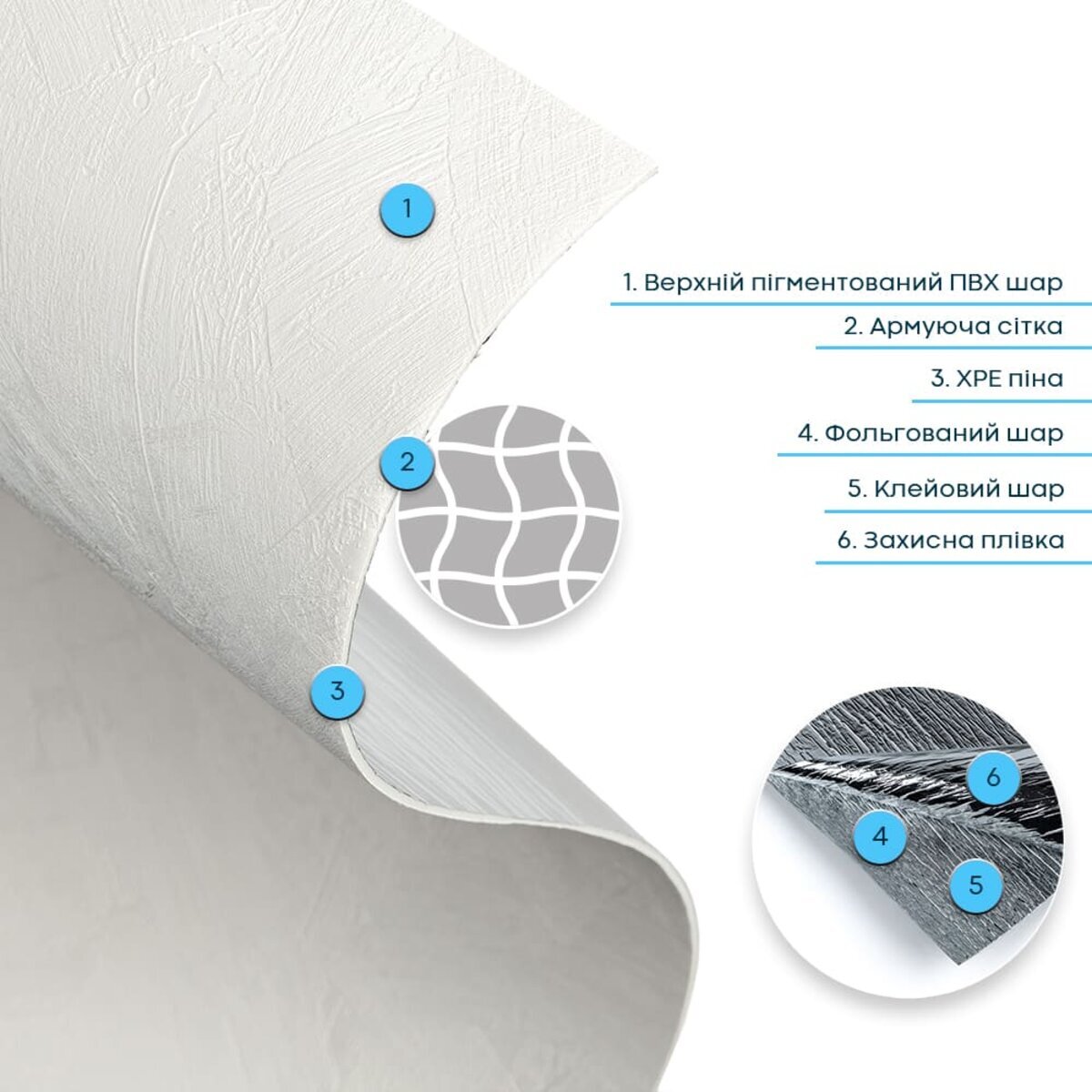 Пігментований ПВХ шар — це декоративний верхній шар із полівінілхлориду з додаванням пігментів та стабілізаторів, які забезпечують стійкість кольору та захист від УФ-випромінювання. Цей шар формує детальну фактуру й дизайн матеріалу, максимально наближені до декоративної штукатурки, включаючи дрібні нерівності та текстурні вкраплення. Він стійкий до вологи та впливу хімічних речовин, дуже гнучкий, не схильний до заломів і має здатність відновлювати форму після деформації. Армувальна сітка — це внутрішній зміцнювальний шар, який підвищує стабільність і міцність верхнього шару ПВХ. Виготовлена зі синтетичного матеріалу, вона не розтягується, допомагає зберігати форму та фактуру під час монтажу й експлуатації, а також запобігає деформаціям матеріалу.ХРЕ (спінений поліетилен) — це матеріал, який роблять із поліетилену, спеціально переплавляючи його та “зшиваючи” молекули між собою. Завдяки такій технології матеріал стає міцнішим і краще витримує температуру. Усередині ХРЕ є багато дрібних закритих комірок — саме через це він виходить легким, пружним і добре утримує тепло. Закрита структура також робить його стійким до вологи та довговічним у використанні.Фольгований шар виконує дві ключові функції: він відбиває теплові хвилі, забезпечуючи додаткову теплоізоляцію, а також захищає матеріал від вологи. Завдяки цьому шпалери стають більш стійкими до вологого середовища та чудово підходять для використання на кухнях. Окрім цього, фольгований шар додатково зміцнює ХРЕ-основу, запобігаючи її розтягуванню та зберігаючи форму матеріалу під час монтажу та експлуатації.Подвійний клейовий шар: нетоксична основа з високим рівнем адгезії.Захисна фольгована плівка: оберігає клейовий шар від пересихання та забруднення, легко знімається під час монтажу.Застосування: внутрішні оздоблювальні роботи: декорування стін у всіх видах житлових приміщень (кухня, ванна кімната, вітальня, дитяча або спальня, вхідна група) та комерційних приміщень (офісні приміщення, зони рецепцій, магазини, салони краси або фітнес-центри, місця громадської присутності, майстерні), меблів, дверей та інших рівних поверхонь.