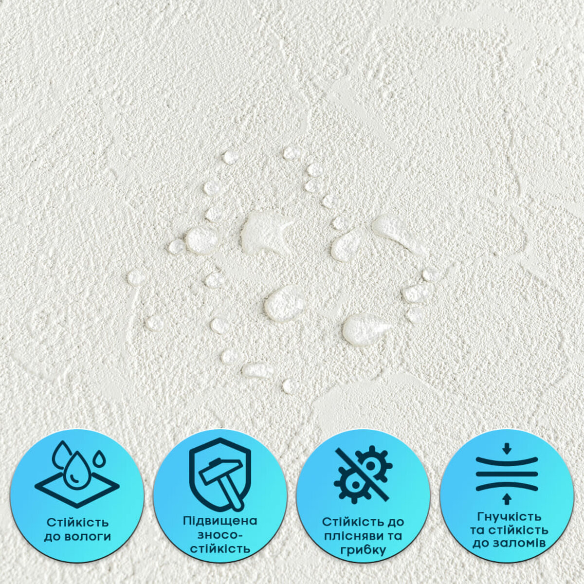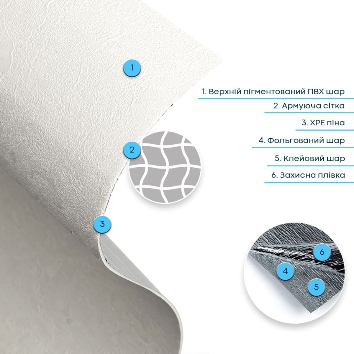 Пігментований ПВХ шар — це декоративний верхній шар із полівінілхлориду з додаванням пігментів та стабілізаторів, які забезпечують стійкість кольору та захист від УФ-випромінювання. Цей шар формує детальну фактуру й дизайн матеріалу, максимально наближені до декоративної штукатурки, включаючи дрібні нерівності та текстурні вкраплення. Він стійкий до вологи та впливу хімічних речовин, дуже гнучкий, не схильний до заломів і має здатність відновлювати форму після деформації. Армувальна сітка — це внутрішній зміцнювальний шар, який підвищує стабільність і міцність верхнього шару ПВХ. Виготовлена зі синтетичного матеріалу, вона не розтягується, допомагає зберігати форму та фактуру під час монтажу й експлуатації, а також запобігає деформаціям матеріалу.ХРЕ (спінений поліетилен) — це матеріал, який роблять із поліетилену, спеціально переплавляючи його та “зшиваючи” молекули між собою. Завдяки такій технології матеріал стає міцнішим і краще витримує температуру. Усередині ХРЕ є багато дрібних закритих комірок — саме через це він виходить легким, пружним і добре утримує тепло. Закрита структура також робить його стійким до вологи та довговічним у використанні.Фольгований шар виконує дві ключові функції: він відбиває теплові хвилі, забезпечуючи додаткову теплоізоляцію, а також захищає матеріал від вологи. Завдяки цьому шпалери стають більш стійкими до вологого середовища та чудово підходять для використання на кухнях. Окрім цього, фольгований шар додатково зміцнює ХРЕ-основу, запобігаючи її розтягуванню та зберігаючи форму матеріалу під час монтажу та експлуатації.Подвійний клейовий шар: нетоксична основа з високим рівнем адгезії.Захисна фольгована плівка: оберігає клейовий шар від пересихання та забруднення, легко знімається під час монтажу.Застосування: внутрішні оздоблювальні роботи: декорування стін у всіх видах житлових приміщень (кухня, ванна кімната, вітальня, дитяча або спальня, вхідна група) та комерційних приміщень (офісні приміщення, зони рецепцій, магазини, салони краси або фітнес-центри, місця громадської присутності, майстерні), меблів, дверей та інших рівних поверхонь.