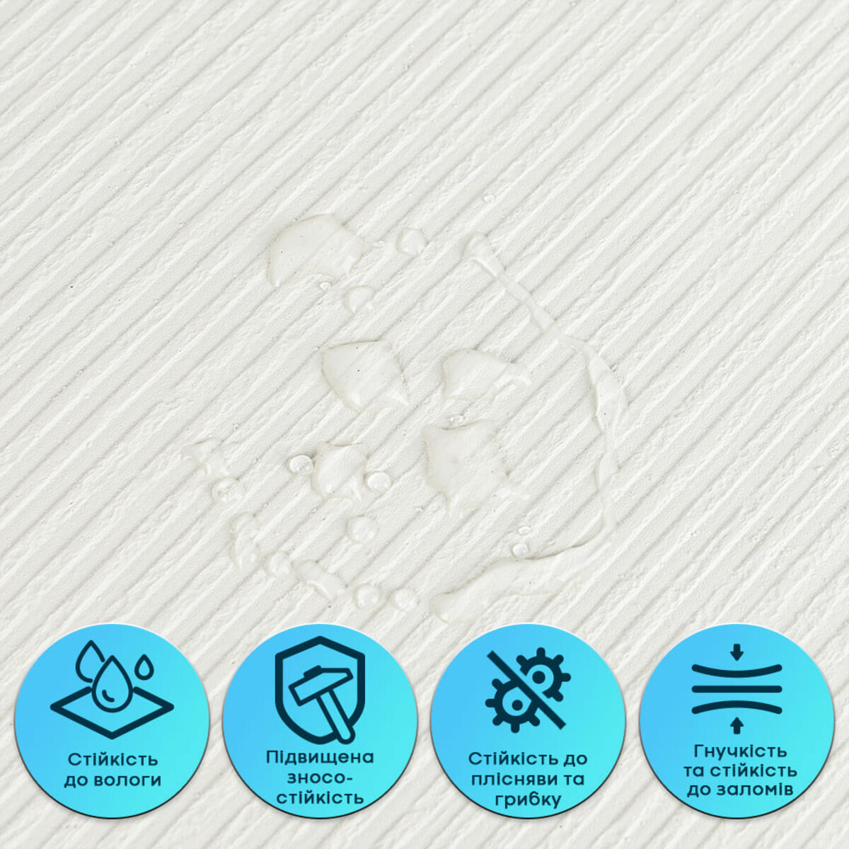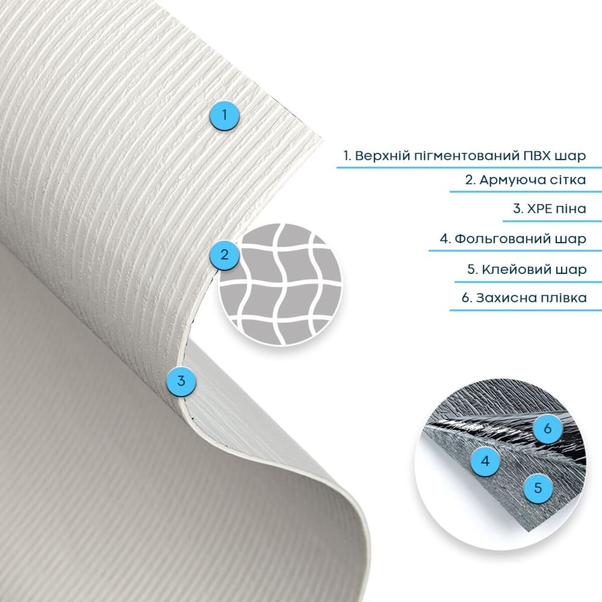 Пігментований ПВХ шар — це декоративний верхній шар із полівінілхлориду з додаванням пігментів та стабілізаторів, які забезпечують стійкість кольору та захист від УФ-випромінювання. Цей шар формує детальну фактуру й дизайн матеріалу, максимально наближені до декоративної штукатурки, включаючи дрібні нерівності та текстурні вкраплення. Він стійкий до вологи та впливу хімічних речовин, дуже гнучкий, не схильний до заломів і має здатність відновлювати форму після деформації. Армувальна сітка — це внутрішній зміцнювальний шар, який підвищує стабільність і міцність верхнього шару ПВХ. Виготовлена зі синтетичного матеріалу, вона не розтягується, допомагає зберігати форму та фактуру під час монтажу й експлуатації, а також запобігає деформаціям матеріалу.ХРЕ (спінений поліетилен) — це матеріал, який роблять із поліетилену, спеціально переплавляючи його та “зшиваючи” молекули між собою. Завдяки такій технології матеріал стає міцнішим і краще витримує температуру. Усередині ХРЕ є багато дрібних закритих комірок — саме через це він виходить легким, пружним і добре утримує тепло. Закрита структура також робить його стійким до вологи та довговічним у використанні.Фольгований шар виконує дві ключові функції: він відбиває теплові хвилі, забезпечуючи додаткову теплоізоляцію, а також захищає матеріал від вологи. Завдяки цьому шпалери стають більш стійкими до вологого середовища та чудово підходять для використання на кухнях. Окрім цього, фольгований шар додатково зміцнює ХРЕ-основу, запобігаючи її розтягуванню та зберігаючи форму матеріалу під час монтажу та експлуатації.Подвійний клейовий шар: нетоксична основа з високим рівнем адгезії.Захисна фольгована плівка: оберігає клейовий шар від пересихання та забруднення, легко знімається під час монтажу.Застосування: внутрішні оздоблювальні роботи: декорування стін у всіх видах житлових приміщень (кухня, ванна кімната, вітальня, дитяча або спальня, вхідна група) та комерційних приміщень (офісні приміщення, зони рецепцій, магазини, салони краси або фітнес-центри, місця громадської присутності, майстерні), меблів, дверей та інших рівних поверхонь.