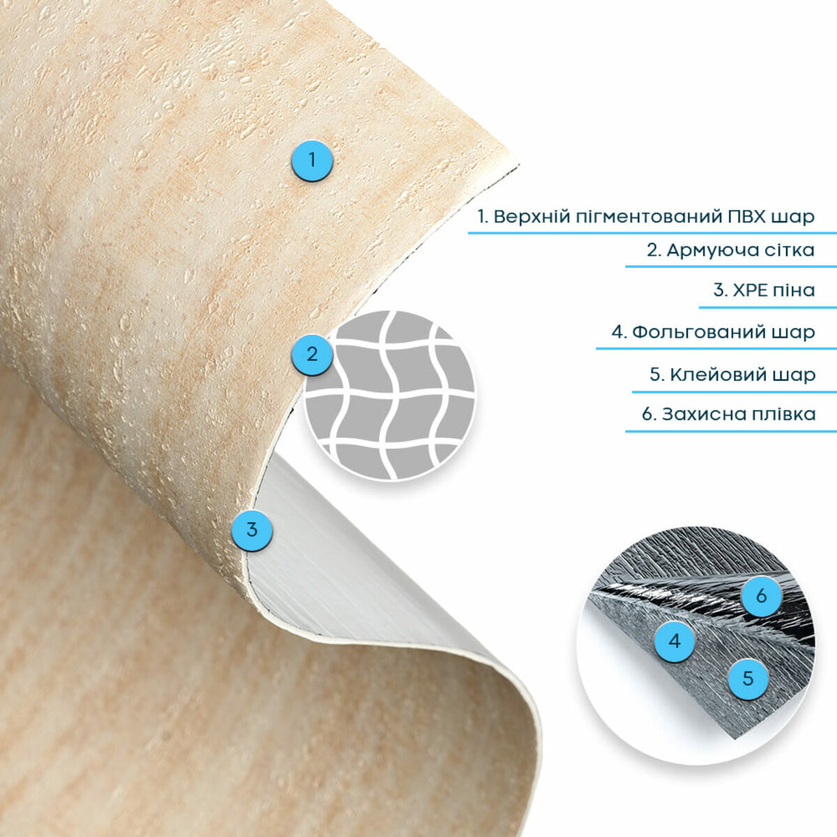 Пігментований ПВХ шар — це декоративний верхній шар із полівінілхлориду з додаванням пігментів та стабілізаторів, які забезпечують стійкість кольору та захист від УФ-випромінювання. Цей шар формує детальну фактуру й дизайн матеріалу, максимально наближені до декоративної штукатурки, включаючи дрібні нерівності та текстурні вкраплення. Він стійкий до вологи та впливу хімічних речовин, дуже гнучкий, не схильний до заломів і має здатність відновлювати форму після деформації. Армувальна сітка — це внутрішній зміцнювальний шар, який підвищує стабільність і міцність верхнього шару ПВХ. Виготовлена зі синтетичного матеріалу, вона не розтягується, допомагає зберігати форму та фактуру під час монтажу й експлуатації, а також запобігає деформаціям матеріалу.ХРЕ (спінений поліетилен) — це матеріал, який роблять із поліетилену, спеціально переплавляючи його та “зшиваючи” молекули між собою. Завдяки такій технології матеріал стає міцнішим і краще витримує температуру. Усередині ХРЕ є багато дрібних закритих комірок — саме через це він виходить легким, пружним і добре утримує тепло. Закрита структура також робить його стійким до вологи та довговічним у використанні.Фольгований шар виконує дві ключові функції: він відбиває теплові хвилі, забезпечуючи додаткову теплоізоляцію, а також захищає матеріал від вологи. Завдяки цьому шпалери стають більш стійкими до вологого середовища та чудово підходять для використання на кухнях. Окрім цього, фольгований шар додатково зміцнює ХРЕ-основу, запобігаючи її розтягуванню та зберігаючи форму матеріалу під час монтажу та експлуатації.Подвійний клейовий шар: нетоксична основа з високим рівнем адгезії.Захисна фольгована плівка: оберігає клейовий шар від пересихання та забруднення, легко знімається під час монтажу.Застосування: внутрішні оздоблювальні роботи: декорування стін у всіх видах житлових приміщень (кухня, ванна кімната, вітальня, дитяча або спальня, вхідна група) та комерційних приміщень (офісні приміщення, зони рецепцій, магазини, салони краси або фітнес-центри, місця громадської присутності, майстерні), меблів, дверей та інших рівних поверхонь.