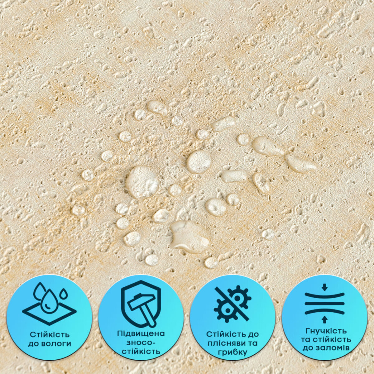Гнучкість без деформаціїМатеріал є еластичним і легко згинається, що дозволяє монтувати його на нерівні та складні поверхні. Завдяки вбудованій армувальній сітці штукатурка не розтягується, не створює заломів і не деформується під час монтажу або експлуатації. Це гарантує стабільну геометрію та акуратний вигляд після наклеювання.Самоклеюча основаШар клею забезпечує швидке та зручне встановлення без додаткових інструментів і матеріалів. Монтаж займає мінімум часу: смуги клеяться стик-у-стик, рівно лягають на поверхню та не розходяться. Матеріал легко ріжеться ножицями або монтажним ножем. Стійкість до вологи та париГнучка штукатурка не вбирає воду, не набухає та не деформується під впливом вологи. Матеріал стійкий до пари, не сприяє утворенню плісняви та підходить для приміщень із підвищеною вологістю — кухонь, ванних кімнат. Може застосовуватися в зоні кухонного фартуха (за умови відступу від плити на 25-30 см).Підвищена міцність та зносостійкістьКомбінація вінілу та армувальної сітки забезпечує матеріалу довговічність. Покриття не тріскається, не кришиться і добре витримує щоденне використання без втрати зовнішнього вигляду.Невибагливість у доглядіПоверхня легко очищається вологою серветкою чи нейтральними мийними засобами. У разі пошкодження елемента його можна швидко замінити без демонтажу всієї поверхні.Тепло- та звукоізоляційні властивостіЗавдяки структурі матеріал помірно приглушує звуки та покращує теплоізоляцію стін, створюючи більш комфортні умови в приміщенні.Екологічна безпекаМатеріал виготовляється з безпечної сировини, не виділяє шкідливих речовин, підходить для житлових приміщень та є нетоксичним для навколишнього середовища. Розрахунок необхідної кількості матеріалу
