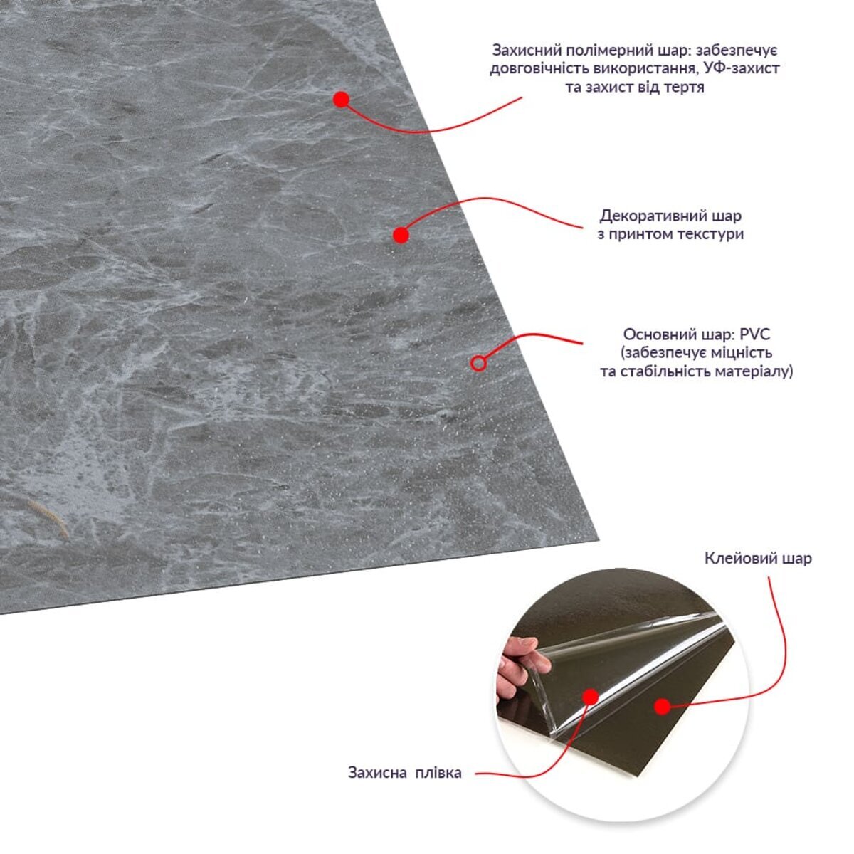 - Декоративний шар: плівка із кольоровим друком, який повністю передає фактуру природних матеріалів: деревини, каменю та інших