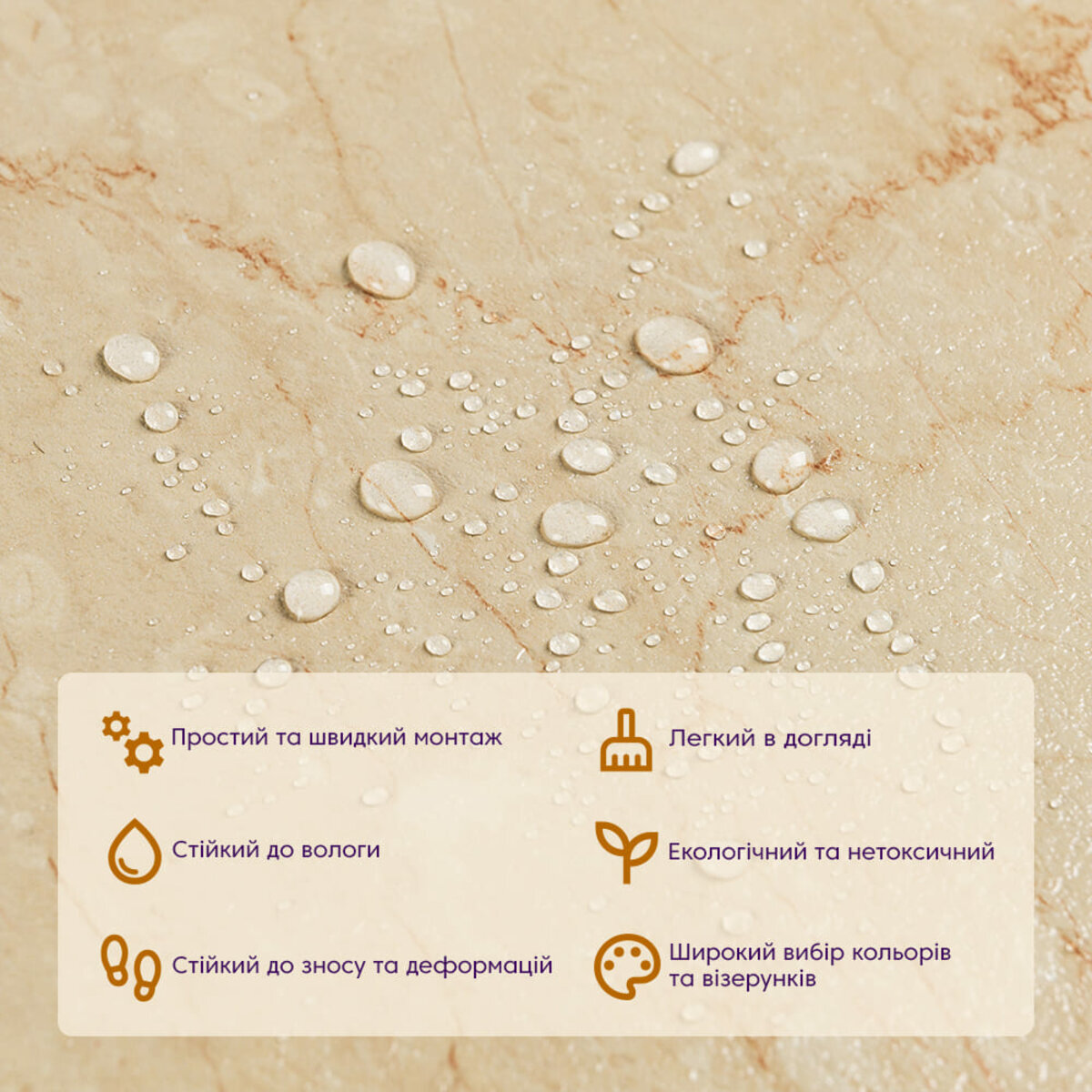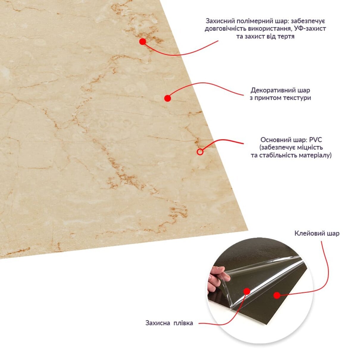 - Декоративний шар: плівка із кольоровим друком, який повністю передає фактуру природних матеріалів: деревини, каменю та інших