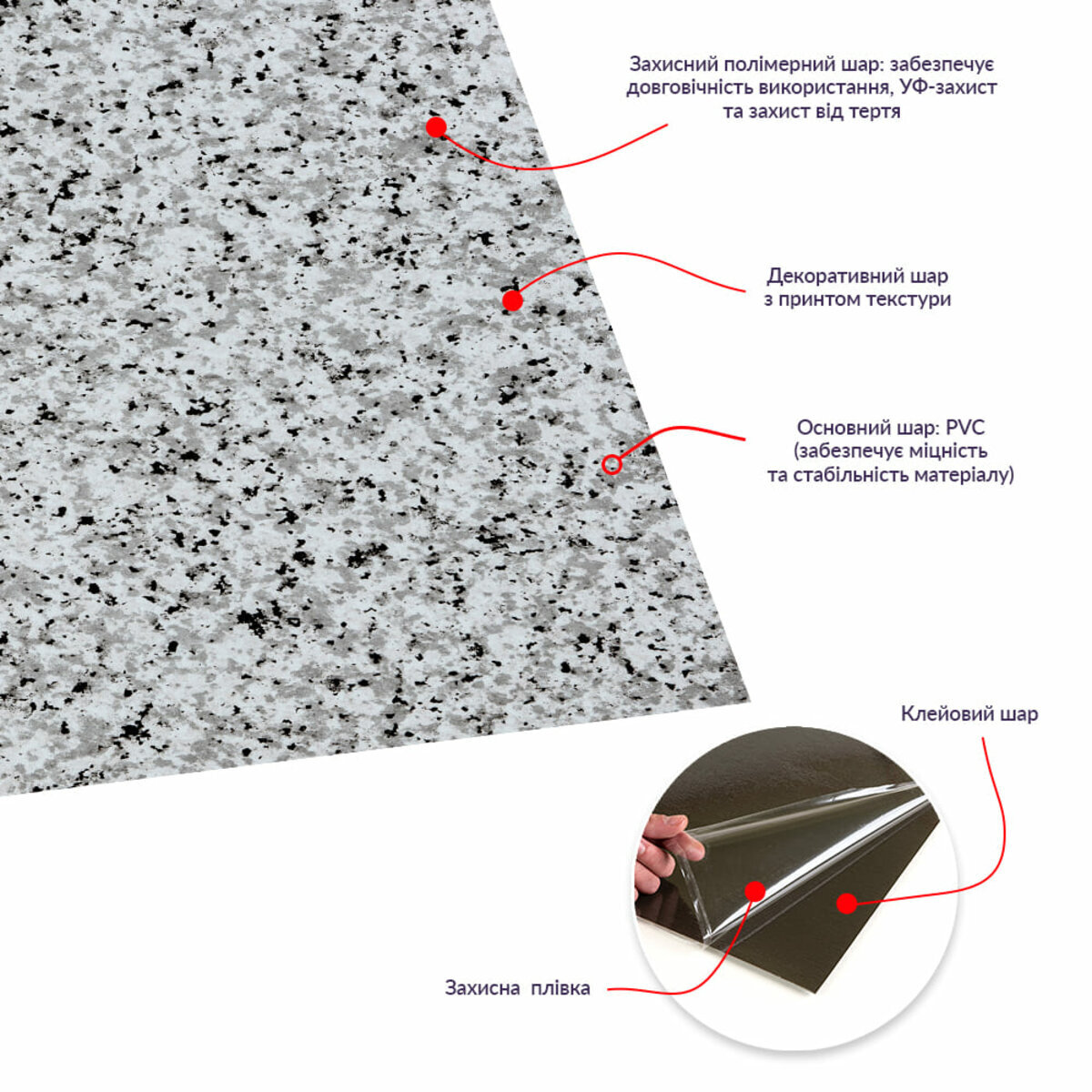- Основний шар: складається із ПВХ та забезпечує міцність та стабільність матеріалу