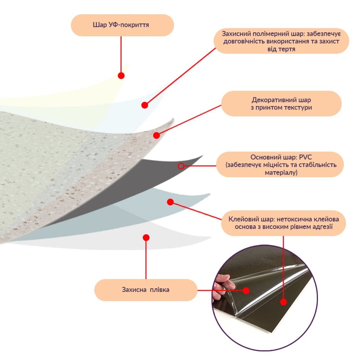 - Декоративний шар: плівка із кольоровим друком, який повністю передає фактуру природних матеріалів: деревини, каменю та інших