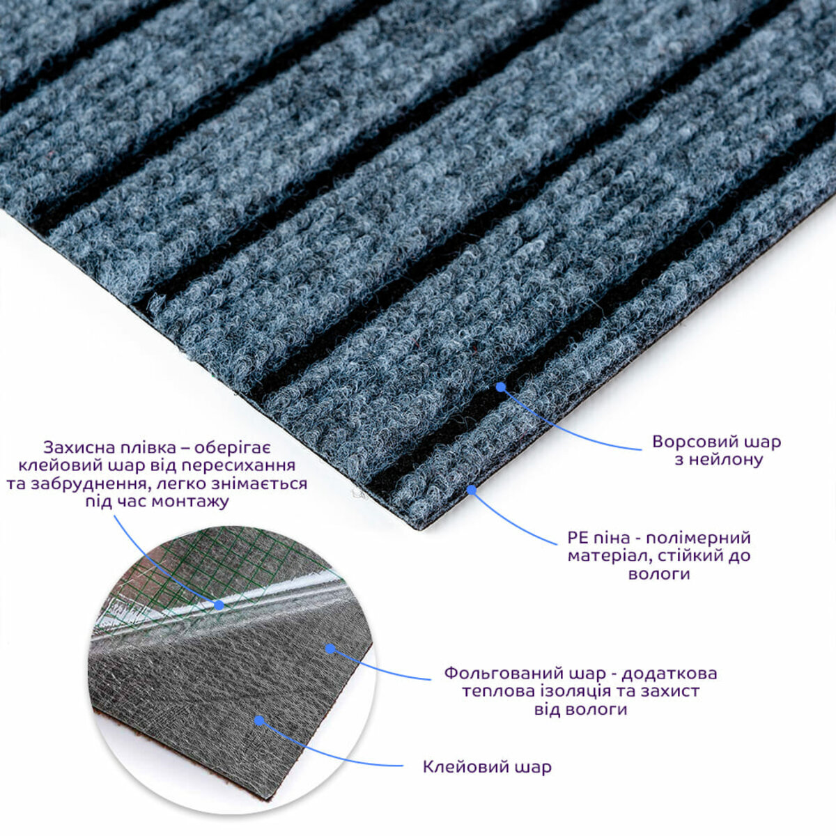 Ворсовий шар з нейлону – складається з волокон, які мають високу міцність на розрив, еластичність, стійкість до вологи і плям. РЕ піна - полімерний матеріал, стійкий до вологи, що має пористу структуру, що складається з безлічі дрібних бульбашок повітря. Також, піна має високу пружність і еластичність, що дозволяє їй повертатися до вихідної форми після стиснення або деформації. Фольгований шар: основна властивість цього шару – відображення теплових хвиль, що дозволяє мінімізувати теплові втрати, тим самим покращити теплоізоляцію приміщення. Клейовий шар: нетоксична основа з високим рівнем адгезії. Захисна плівка: зберігає клейовий шар від пересихання та забруднення, легко знімається під час монтажу. Застосування: внутрішні оздоблювальні роботи: декорування підлоги (можливо і стін) у всіх видах житлових приміщень (кухня, вітальня, дитяча або спальня, вхідна група) та комерційних приміщень (офісні приміщення, зони рецепцій, магазини, салони краси або фітнес-центри, місця громадської присутності, майстерні), а також декорування меблів, дверей та інших рівних поверхонь.