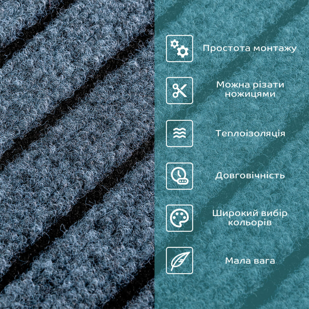 Декоративні можливості: ковролінова плитка пропонує широкий вибір дизайнів, кольорів та текстур, що дозволяє створити унікальний інтер'єр та підкреслити стиль приміщення. Теплоізоляція: ковролін здатний утримувати тепло, що допомагає знизити витрати на опалення в холодну пору року. Догляд: ковролінова плитка легко чиститься і миється, що робить її догляд простим та зручним. Зносостійкість: ковролін має високу стійкість до зносу, що забезпечує його довговічність та тривалий термін служби. Розрахунок потрібної кількості матеріалу: