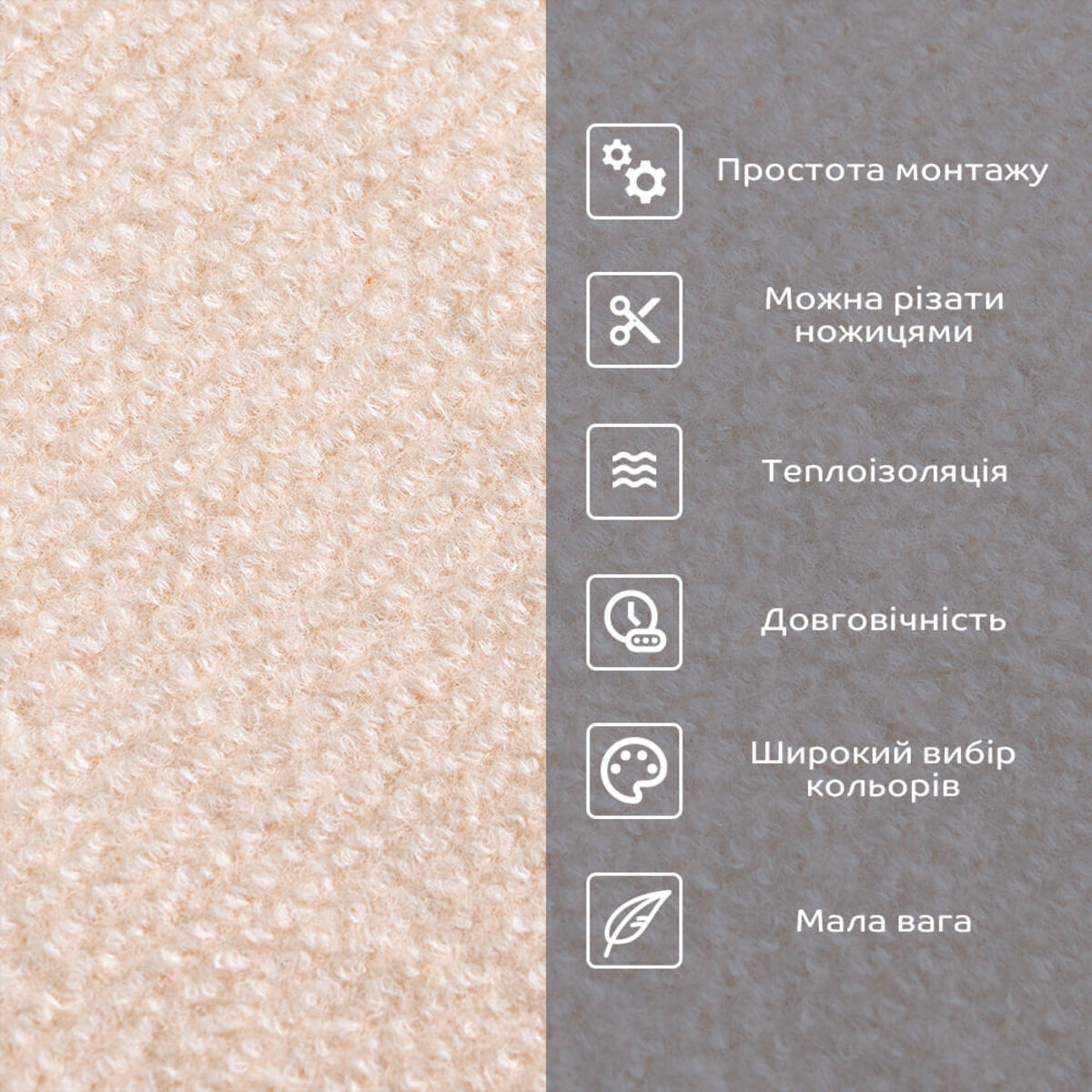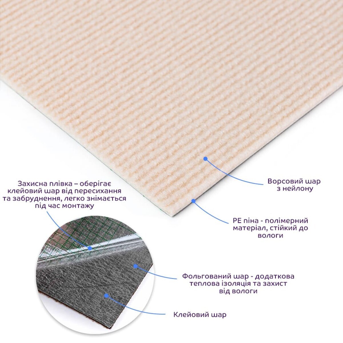 Ворсовий шар з нейлону – складається з волокон, які мають високу міцність на розрив, еластичність, стійкість до вологи і плям. РЕ піна - полімерний матеріал, стійкий до вологи, що має пористу структуру, що складається з безлічі дрібних бульбашок повітря. Також, піна має високу пружність і еластичність, що дозволяє їй повертатися до вихідної форми після стиснення або деформації. Фольгований шар: основна властивість цього шару – відображення теплових хвиль, що дозволяє мінімізувати теплові втрати, тим самим покращити теплоізоляцію приміщення. Клейовий шар: нетоксична основа з високим рівнем адгезії. Захисна плівка: зберігає клейовий шар від пересихання та забруднення, легко знімається під час монтажу. Застосування: внутрішні оздоблювальні роботи: декорування підлоги (можливо і стін) у всіх видах житлових приміщень (кухня, вітальня, дитяча або спальня, вхідна група) та комерційних приміщень (офісні приміщення, зони рецепцій, магазини, салони краси або фітнес-центри, місця громадської присутності, майстерні), а також декорування меблів, дверей та інших рівних поверхонь.