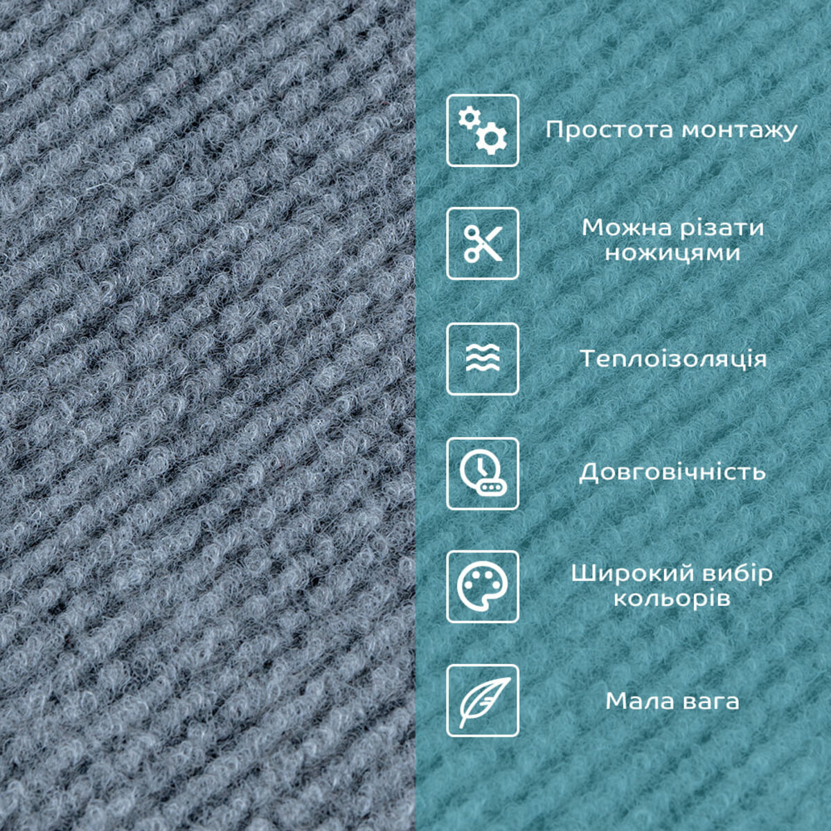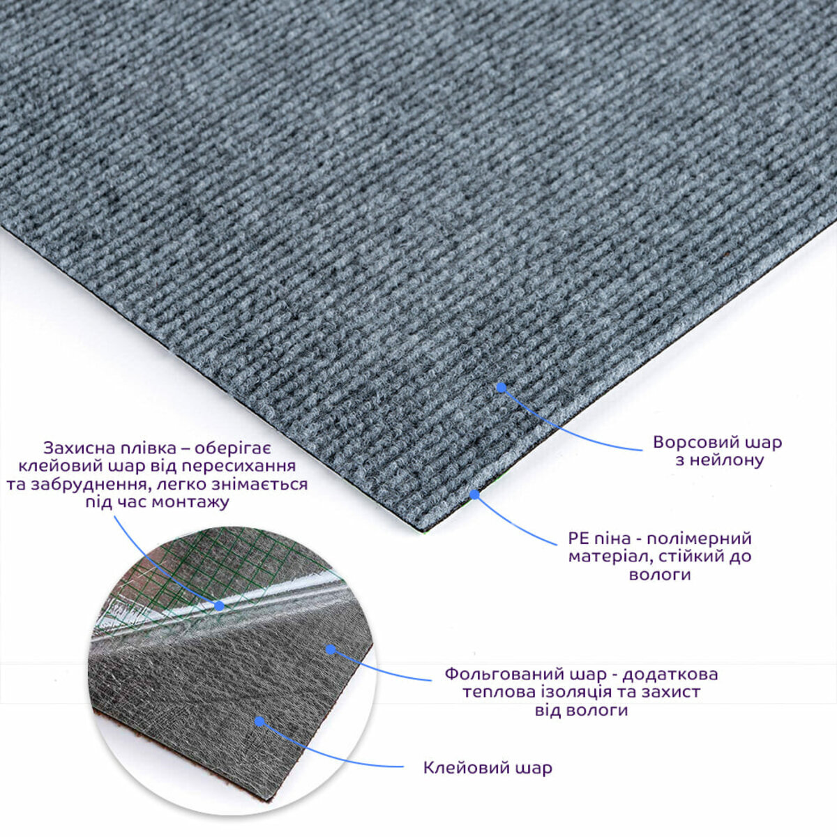 Ворсовий шар з нейлону – складається з волокон, які мають високу міцність на розрив, еластичність, стійкість до вологи і плям. РЕ піна - полімерний матеріал, стійкий до вологи, що має пористу структуру, що складається з безлічі дрібних бульбашок повітря. Також, піна має високу пружність і еластичність, що дозволяє їй повертатися до вихідної форми після стиснення або деформації. Фольгований шар: основна властивість цього шару – відображення теплових хвиль, що дозволяє мінімізувати теплові втрати, тим самим покращити теплоізоляцію приміщення. Клейовий шар: нетоксична основа з високим рівнем адгезії. Захисна плівка: зберігає клейовий шар від пересихання та забруднення, легко знімається під час монтажу. Застосування: внутрішні оздоблювальні роботи: декорування підлоги (можливо і стін) у всіх видах житлових приміщень (кухня, вітальня, дитяча або спальня, вхідна група) та комерційних приміщень (офісні приміщення, зони рецепцій, магазини, салони краси або фітнес-центри, місця громадської присутності, майстерні), а також декорування меблів, дверей та інших рівних поверхонь.
