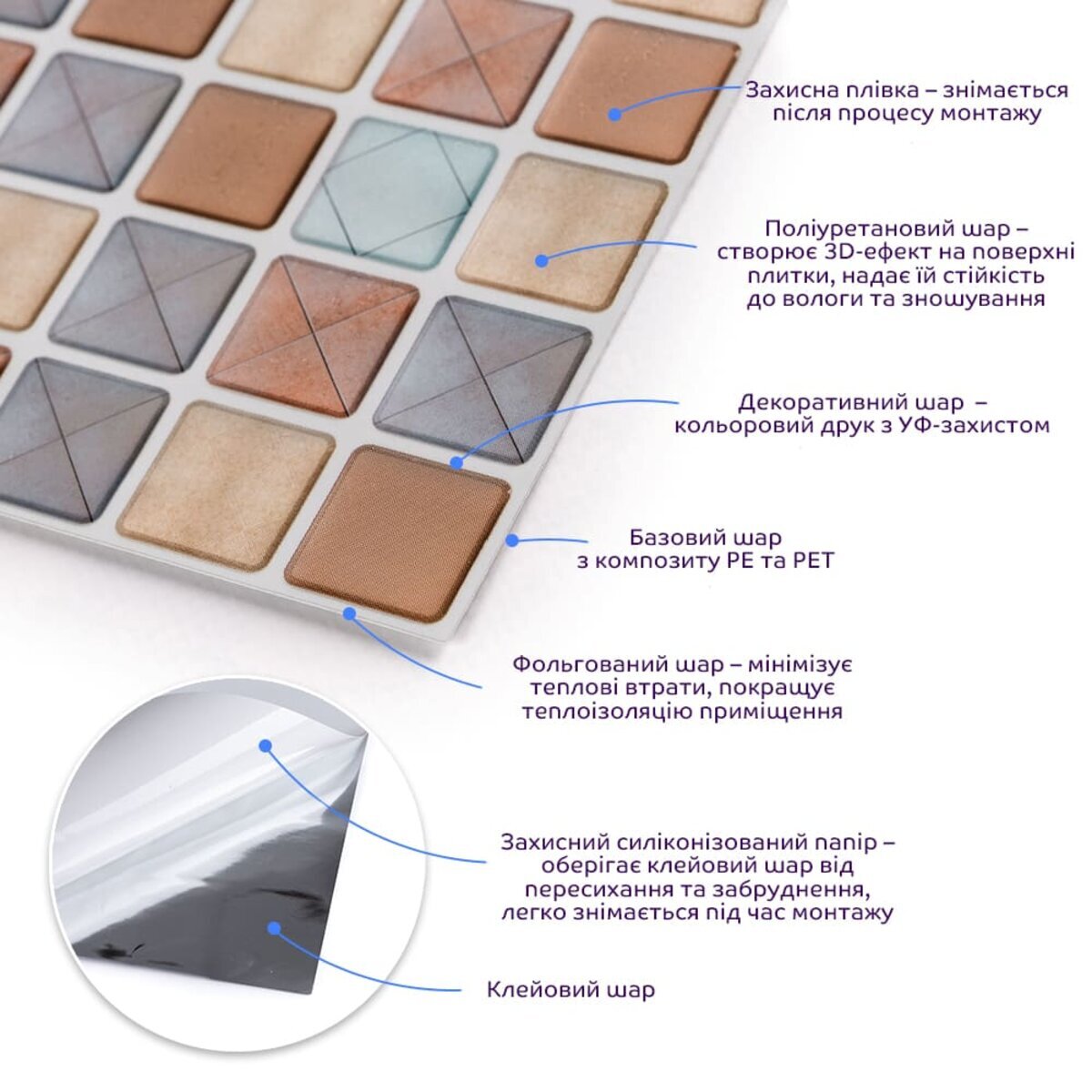 Захисна плівка: зберігає поліуретанову поверхню від подряпин, відколів та інших механічних пошкоджень у процесі транспортування. Після проведення монтажу плівка знімається з поверхні плитки. Поліуретановий шар: створює 3D-ефект на поверхні плитки. Поліуретан є полімером, який формується шляхом хімічної сполуки ізоціанату та поліолу, що призводить до утворення сегментованої молекулярної структури. Декоративний шар: кольоровий друк високої роздільної здатності, що імітує фактуру керамічної плитки та частково природних матеріалів, завдяки чіткому та детальному зображенню, а УФ-захист допомагає запобігти вигорянню, зберігаючи колір насиченим. Базовий шар з РЕТ: суміші поліетилентерефталату (PET) і поліетилену (PE) - матеріал, що складається з молекулярних одиниць етиленгліколю і терефталевої кислоти, що повторюються, має аморфну структуру, завдяки чому, матеріал наділений жароміцністю (до +75º С), стійкістю до стирання та вологи. Поліетилен (РЕ), присутні у складі з поліетилентерефталатом (PET), наділяє його стійкістю до хімічних речовин та механічних пошкоджень, при цьому матеріал залишається пружним. Фольгований шар: основна властивість цього шару – відображення теплових хвиль, що дозволяє мінімізувати теплові втрати, тим самим покращити теплоізоляцію приміщення. Клейовий шар: нетоксична основа з високим рівнем адгезії. Захисний силіконізований папір: зберігає клейовий шар від пересихання та забруднення, легко знімається під час монтажу. Застосування: внутрішні оздоблювальні роботи: декорування стін у всіх видах житлових приміщень (кухня, вітальня, дитяча або спальня, вхідна група) та комерційних приміщень (офісні приміщення, зони рецепцій, магазини, салони краси або фітнес-центри), декорування меблів, дверей та інших рівних поверхонь.