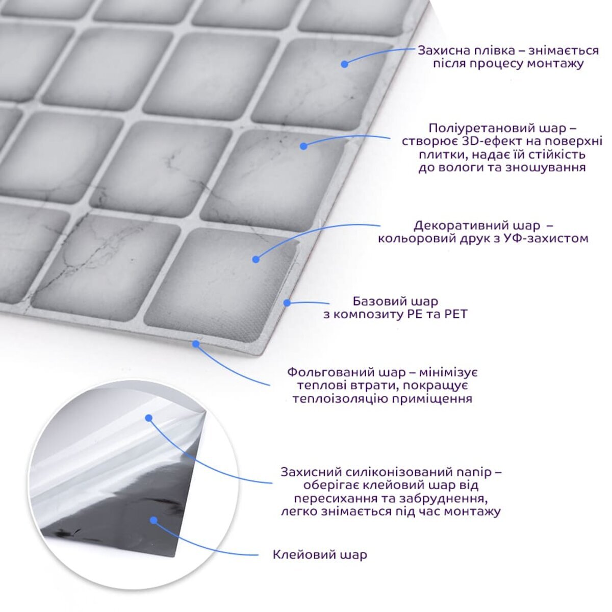 Захисна плівка: зберігає поліуретанову поверхню від подряпин, відколів та інших механічних пошкоджень у процесі транспортування. Після проведення монтажу плівка знімається з поверхні плитки. Поліуретановий шар: створює 3D-ефект на поверхні плитки. Поліуретан є полімером, який формується шляхом хімічної сполуки ізоціанату та поліолу, що призводить до утворення сегментованої молекулярної структури. Декоративний шар: кольоровий друк високої роздільної здатності, що імітує фактуру керамічної плитки та частково природних матеріалів, завдяки чіткому та детальному зображенню, а УФ-захист допомагає запобігти вигорянню, зберігаючи колір насиченим. Базовий шар з РЕТ: суміші поліетилентерефталату (PET) і поліетилену (PE) - матеріал, що складається з молекулярних одиниць етиленгліколю і терефталевої кислоти, що повторюються, має аморфну структуру, завдяки чому, матеріал наділений жароміцністю (до +75º С), стійкістю до стирання та вологи. Поліетилен (РЕ), присутні у складі з поліетилентерефталатом (PET), наділяє його стійкістю до хімічних речовин та механічних пошкоджень, при цьому матеріал залишається пружним. Фольгований шар: основна властивість цього шару – відображення теплових хвиль, що дозволяє мінімізувати теплові втрати, тим самим покращити теплоізоляцію приміщення. Клейовий шар: нетоксична основа з високим рівнем адгезії. Захисний силіконізований папір: зберігає клейовий шар від пересихання та забруднення, легко знімається під час монтажу. Застосування: внутрішні оздоблювальні роботи: декорування стін у всіх видах житлових приміщень (кухня, вітальня, дитяча або спальня, вхідна група) та комерційних приміщень (офісні приміщення, зони рецепцій, магазини, салони краси або фітнес-центри), декорування меблів, дверей та інших рівних поверхонь.