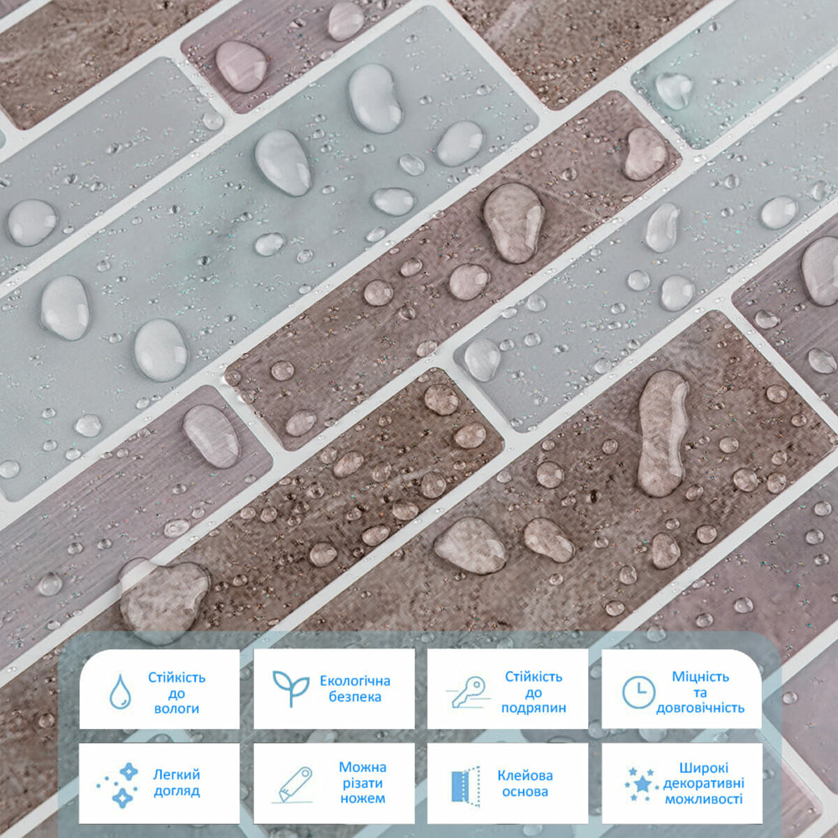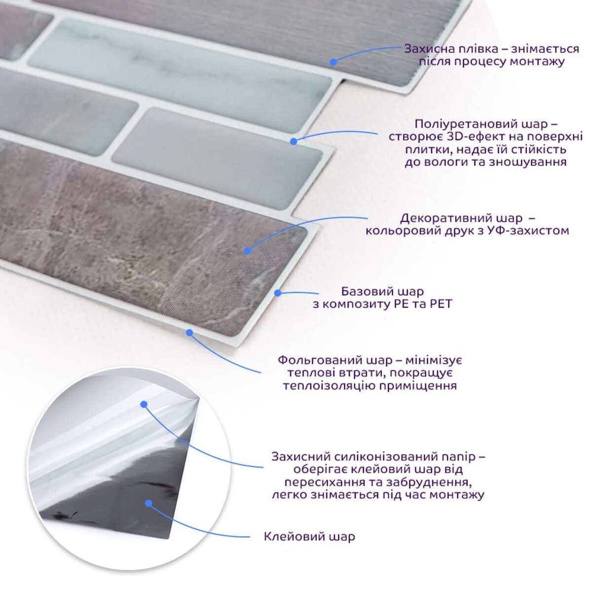 Захисна плівка: зберігає поліуретанову поверхню від подряпин, відколів та інших механічних пошкоджень у процесі транспортування. Після проведення монтажу плівка знімається з поверхні плитки. Поліуретановий шар: створює 3D-ефект на поверхні плитки. Поліуретан є полімером, який формується шляхом хімічної сполуки ізоціанату та поліолу, що призводить до утворення сегментованої молекулярної структури. Декоративний шар: кольоровий друк високої роздільної здатності, що імітує фактуру керамічної плитки та частково природних матеріалів, завдяки чіткому та детальному зображенню, а УФ-захист допомагає запобігти вигорянню, зберігаючи колір насиченим. Базовий шар з РЕТ: суміші поліетилентерефталату (PET) і поліетилену (PE) - матеріал, що складається з молекулярних одиниць етиленгліколю і терефталевої кислоти, що повторюються, має аморфну структуру, завдяки чому, матеріал наділений жароміцністю (до +75º С), стійкістю до стирання та вологи. Поліетилен (РЕ), присутні у складі з поліетилентерефталатом (PET), наділяє його стійкістю до хімічних речовин та механічних пошкоджень, при цьому матеріал залишається пружним. Фольгований шар: основна властивість цього шару – відображення теплових хвиль, що дозволяє мінімізувати теплові втрати, тим самим покращити теплоізоляцію приміщення. Клейовий шар: нетоксична основа з високим рівнем адгезії. Захисний силіконізований папір: зберігає клейовий шар від пересихання та забруднення, легко знімається під час монтажу. Застосування: внутрішні оздоблювальні роботи: декорування стін у всіх видах житлових приміщень (кухня, вітальня, дитяча або спальня, вхідна група) та комерційних приміщень (офісні приміщення, зони рецепцій, магазини, салони краси або фітнес-центри), декорування меблів, дверей та інших рівних поверхонь.
