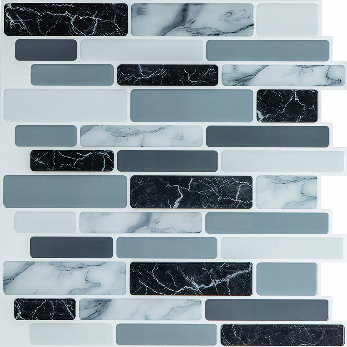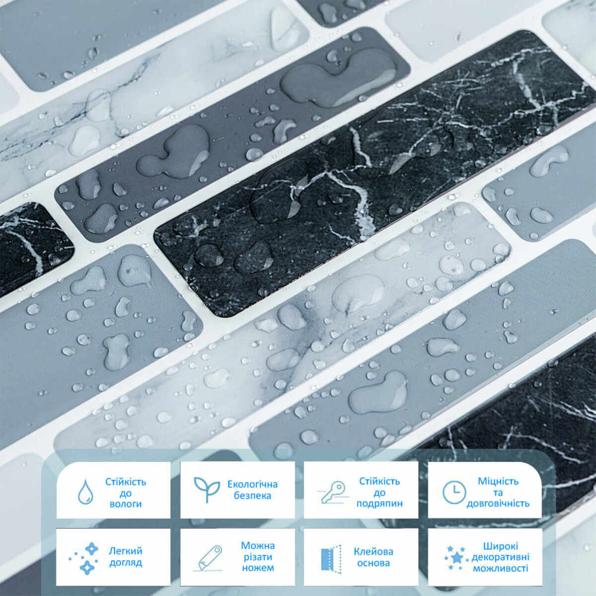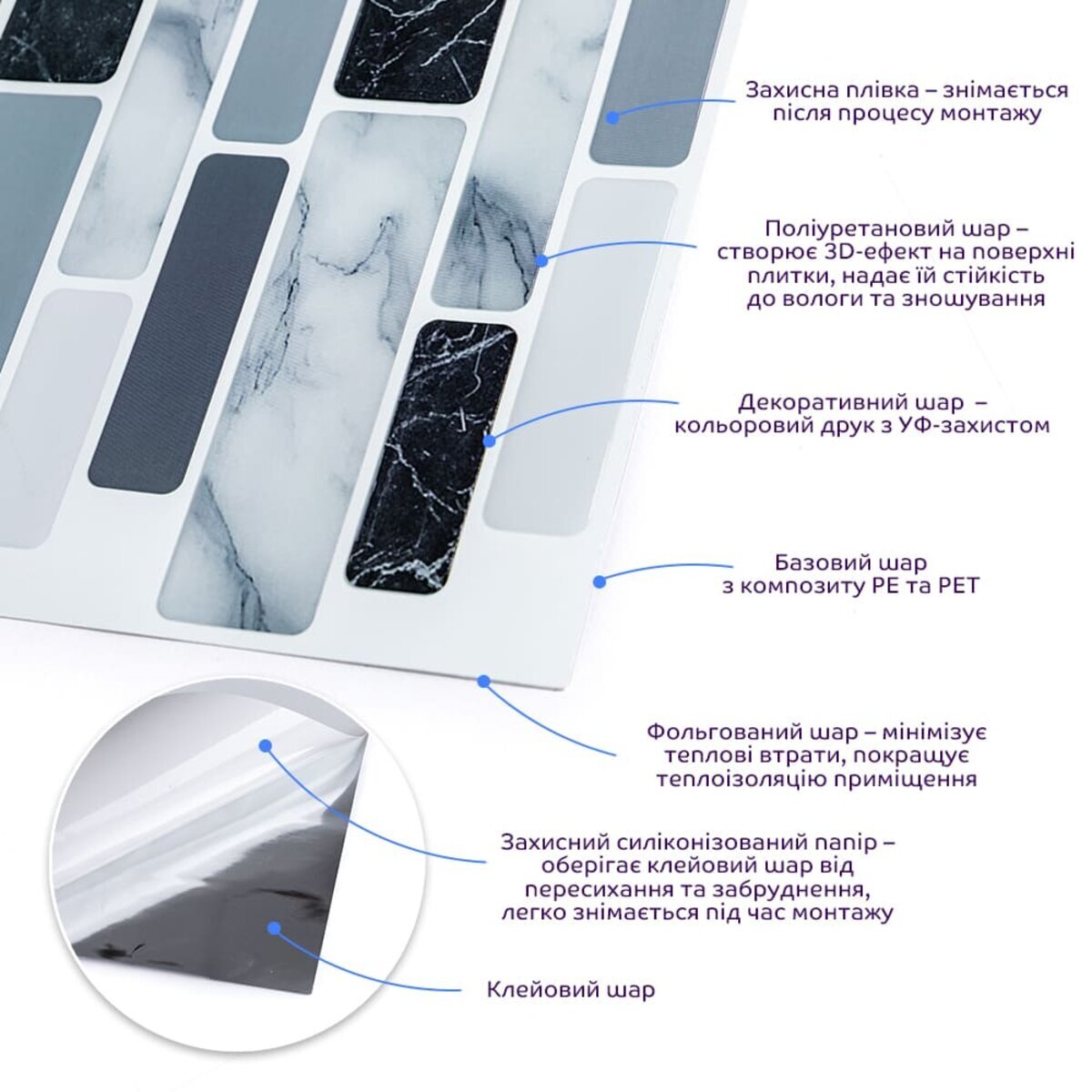 Захисна плівка: зберігає поліуретанову поверхню від подряпин, відколів та інших механічних пошкоджень у процесі транспортування. Після проведення монтажу плівка знімається з поверхні плитки. Поліуретановий шар: створює 3D-ефект на поверхні плитки. Поліуретан є полімером, який формується шляхом хімічної сполуки ізоціанату та поліолу, що призводить до утворення сегментованої молекулярної структури. Декоративний шар: кольоровий друк високої роздільної здатності, що імітує фактуру керамічної плитки та частково природних матеріалів, завдяки чіткому та детальному зображенню, а УФ-захист допомагає запобігти вигорянню, зберігаючи колір насиченим. Базовий шар з РЕТ: суміші поліетилентерефталату (PET) і поліетилену (PE) - матеріал, що складається з молекулярних одиниць етиленгліколю і терефталевої кислоти, що повторюються, має аморфну структуру, завдяки чому, матеріал наділений жароміцністю (до +75º С), стійкістю до стирання та вологи. Поліетилен (РЕ), присутні у складі з поліетилентерефталатом (PET), наділяє його стійкістю до хімічних речовин та механічних пошкоджень, при цьому матеріал залишається пружним. Фольгований шар: основна властивість цього шару – відображення теплових хвиль, що дозволяє мінімізувати теплові втрати, тим самим покращити теплоізоляцію приміщення. Клейовий шар: нетоксична основа з високим рівнем адгезії. Захисний силіконізований папір: зберігає клейовий шар від пересихання та забруднення, легко знімається під час монтажу. Застосування: внутрішні оздоблювальні роботи: декорування стін у всіх видах житлових приміщень (кухня, вітальня, дитяча або спальня, вхідна група) та комерційних приміщень (офісні приміщення, зони рецепцій, магазини, салони краси або фітнес-центри), декорування меблів, дверей та інших рівних поверхонь.