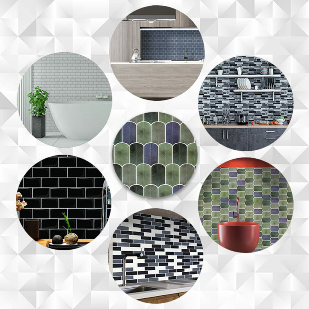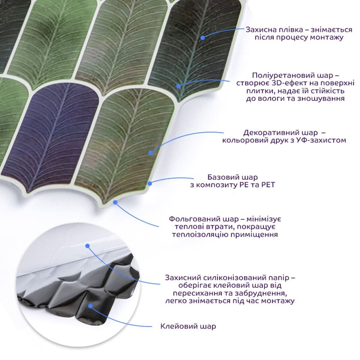 Захисна плівка: зберігає поліуретанову поверхню від подряпин, відколів та інших механічних пошкоджень у процесі транспортування. Після проведення монтажу плівка знімається з поверхні плитки. Поліуретановий шар: створює 3D-ефект на поверхні плитки. Поліуретан є полімером, який формується шляхом хімічної сполуки ізоціанату та поліолу, що призводить до утворення сегментованої молекулярної структури. Декоративний шар: кольоровий друк високої роздільної здатності, що імітує фактуру керамічної плитки та частково природних матеріалів, завдяки чіткому та детальному зображенню, а УФ-захист допомагає запобігти вигорянню, зберігаючи колір насиченим. Базовий шар з РЕТ: суміші поліетилентерефталату (PET) і поліетилену (PE) - матеріал, що складається з молекулярних одиниць етиленгліколю і терефталевої кислоти, що повторюються, має аморфну структуру, завдяки чому, матеріал наділений жароміцністю (до +75º С), стійкістю до стирання та вологи. Поліетилен (РЕ), присутні у складі з поліетилентерефталатом (PET), наділяє його стійкістю до хімічних речовин та механічних пошкоджень, при цьому матеріал залишається пружним. Фольгований шар: основна властивість цього шару – відображення теплових хвиль, що дозволяє мінімізувати теплові втрати, тим самим покращити теплоізоляцію приміщення. Клейовий шар: нетоксична основа з високим рівнем адгезії. Захисний силіконізований папір: зберігає клейовий шар від пересихання та забруднення, легко знімається під час монтажу. Застосування: внутрішні оздоблювальні роботи: декорування стін у всіх видах житлових приміщень (кухня, вітальня, дитяча або спальня, вхідна група) та комерційних приміщень (офісні приміщення, зони рецепцій, магазини, салони краси або фітнес-центри), декорування меблів, дверей та інших рівних поверхонь.