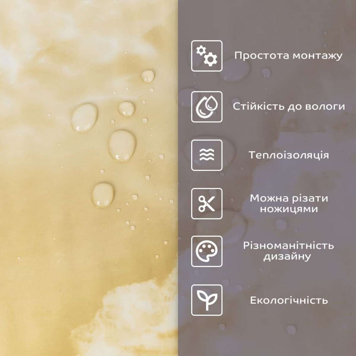 - 1. Легкість та міцність: плитка легка та міцна, що спрощує її логістику, установку та забезпечує довгий термін служби. Матеріал легкий в установці, можна різати ножицями чи монтажним ножем, не потребує додаткових матеріалів чи спеціалістів. Між смугами не розходиться, не роздмухується і не деформується. Відсоток обрізу становить 1%, що є найкращим показником для настінних покриттів;